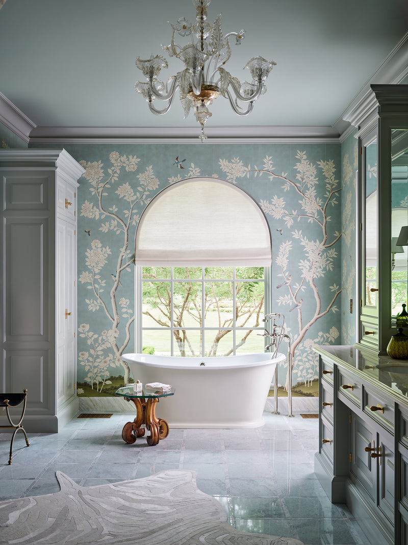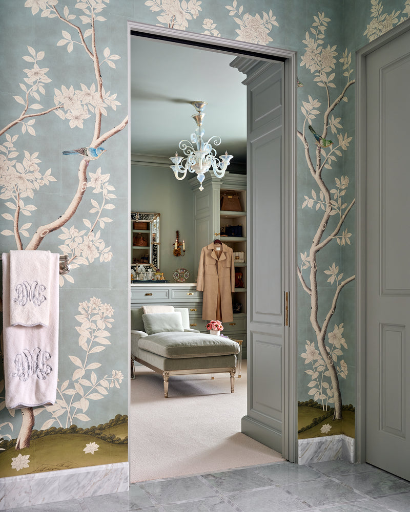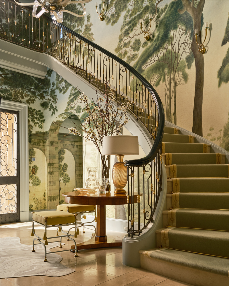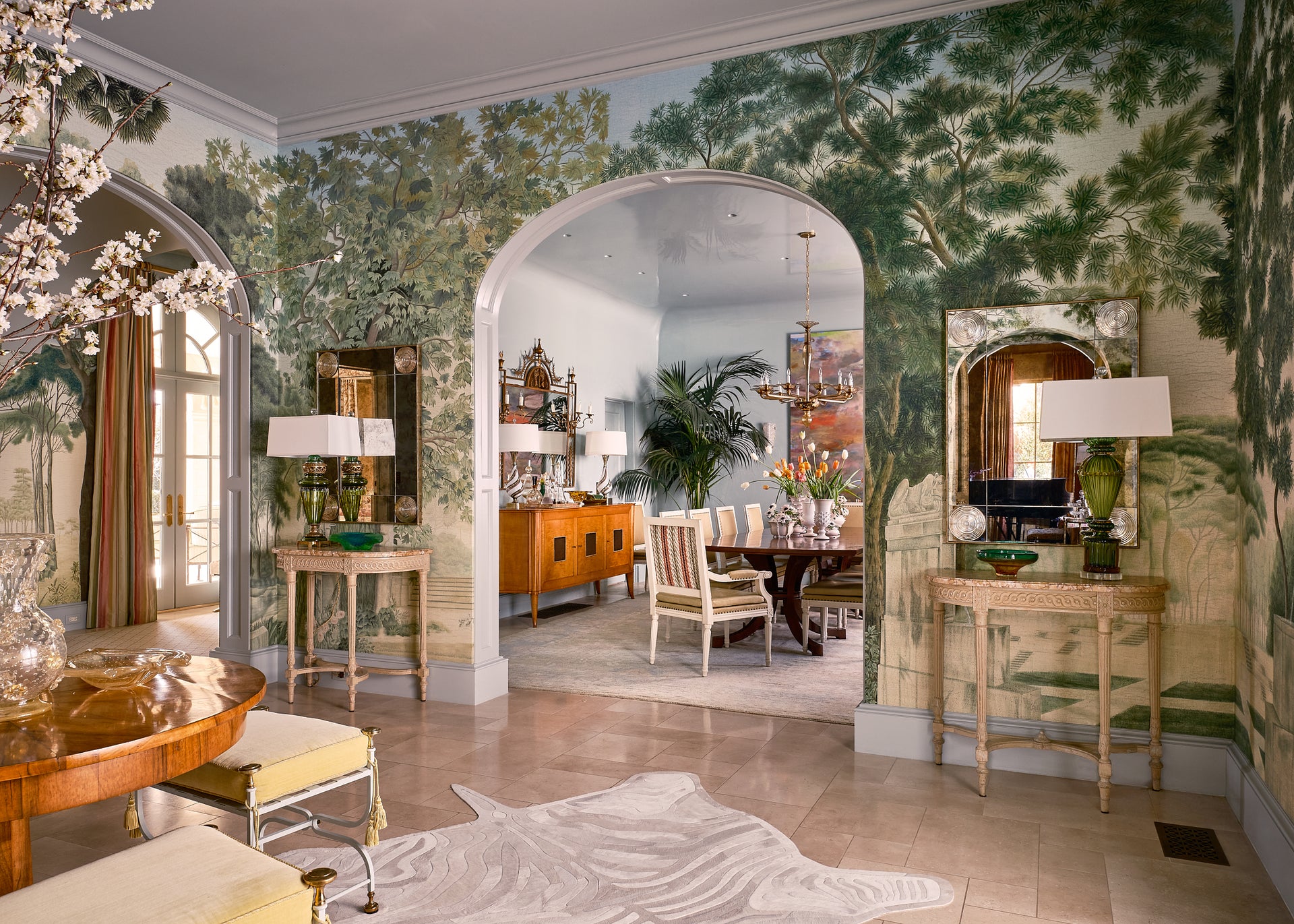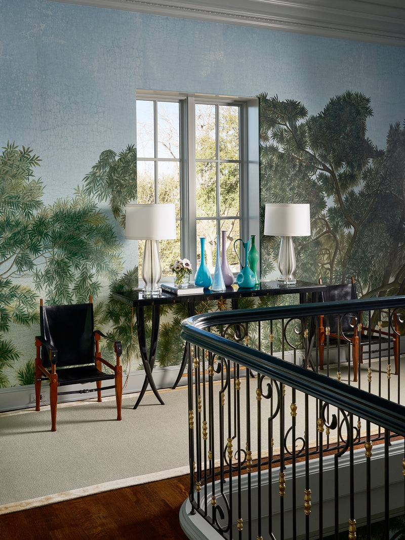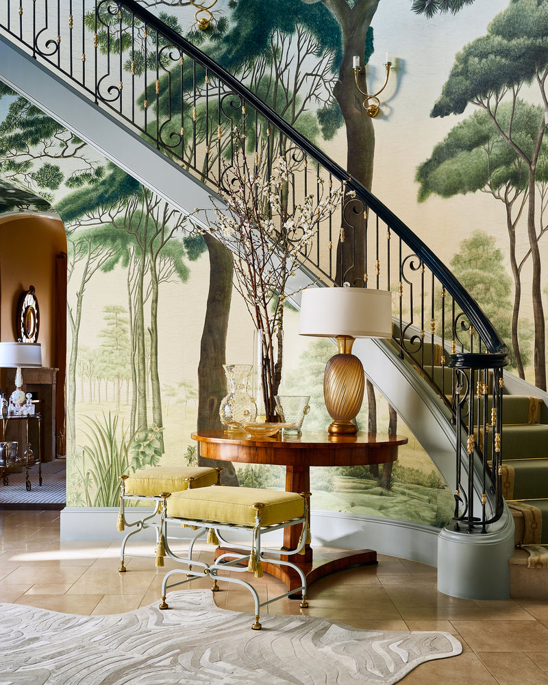 The entry is, of course, a staggering introduction, with fabulous wallpaper that reflects what you see outside. The trees draw your eye in and out at the same time. It truly doesn’t feel over-the-top. It feels enveloping, like being in nature. The property is so private and parklike, it couldn’t help but inspire and influence everything we did.