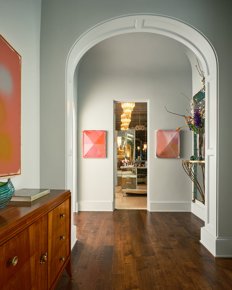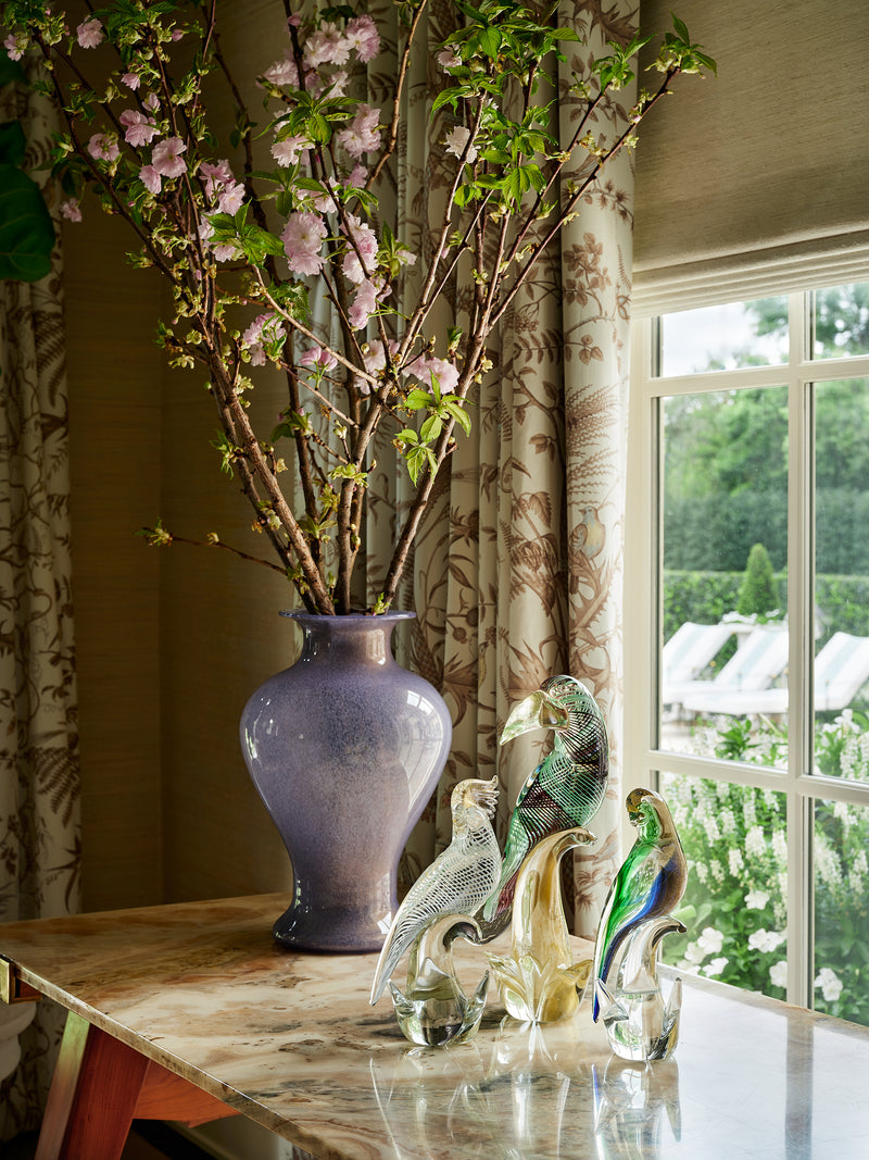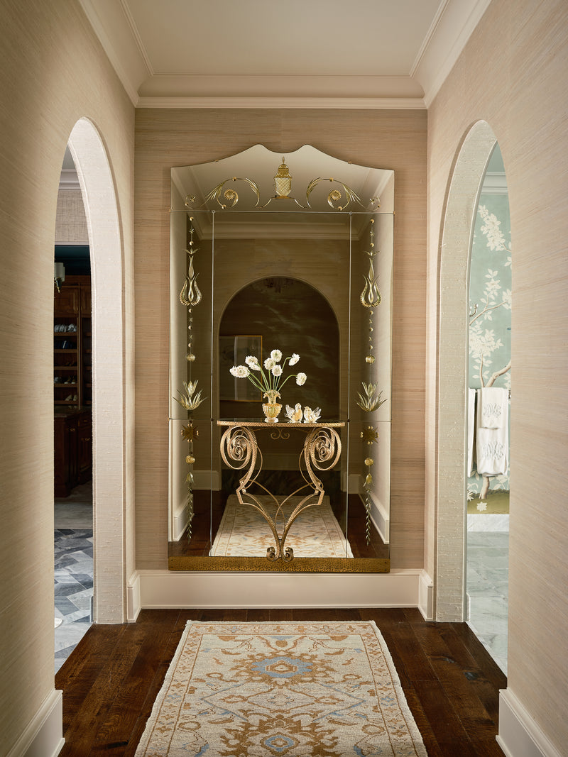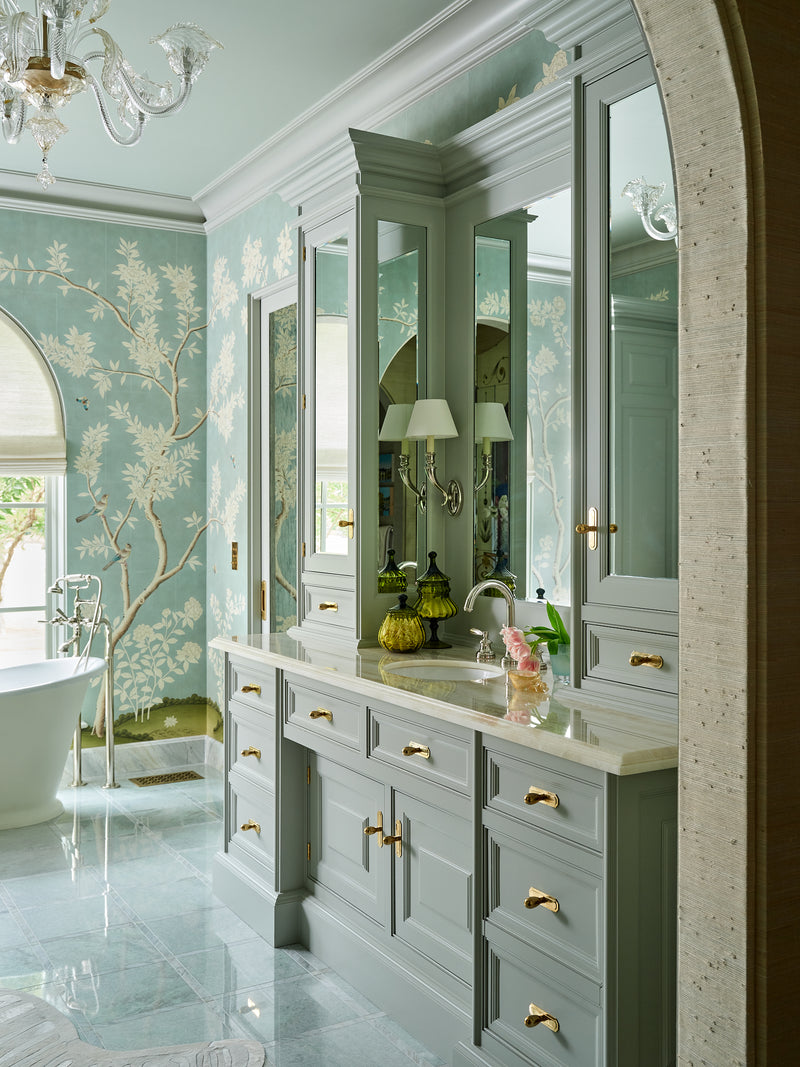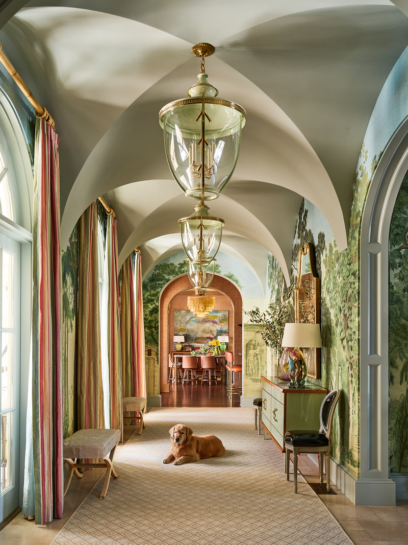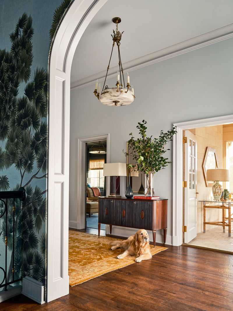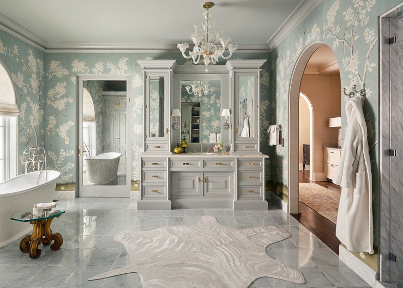 The entry is, of course, a staggering introduction, with fabulous wallpaper that reflects what you see outside. The trees draw your eye in and out at the same time. It truly doesn’t feel over-the-top. It feels enveloping, like being in nature. The property is so private and parklike, it couldn’t help but inspire and influence everything we did.