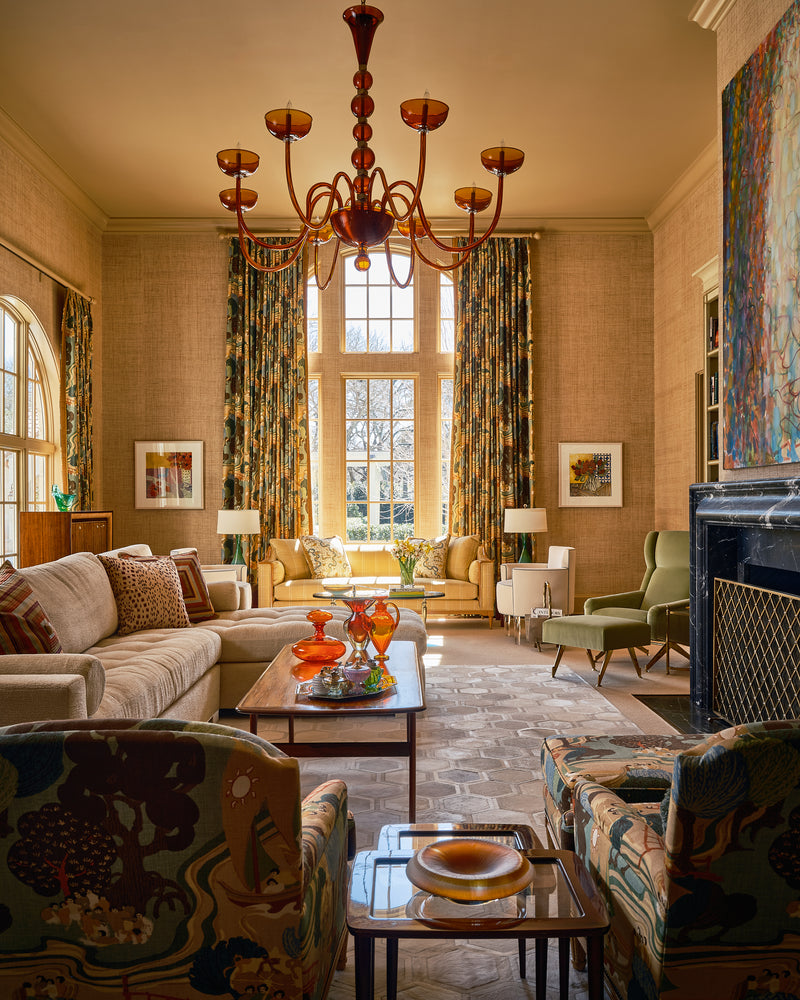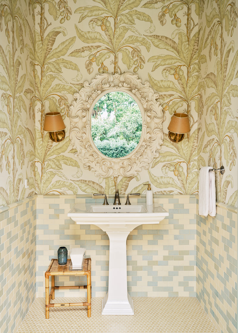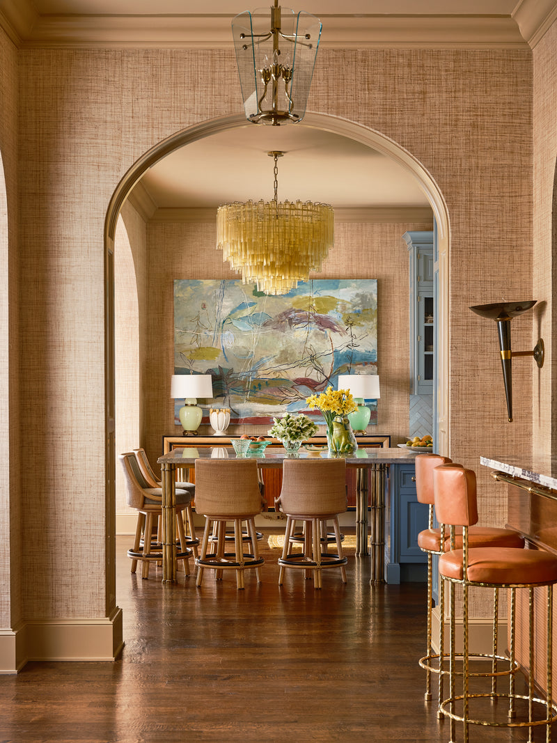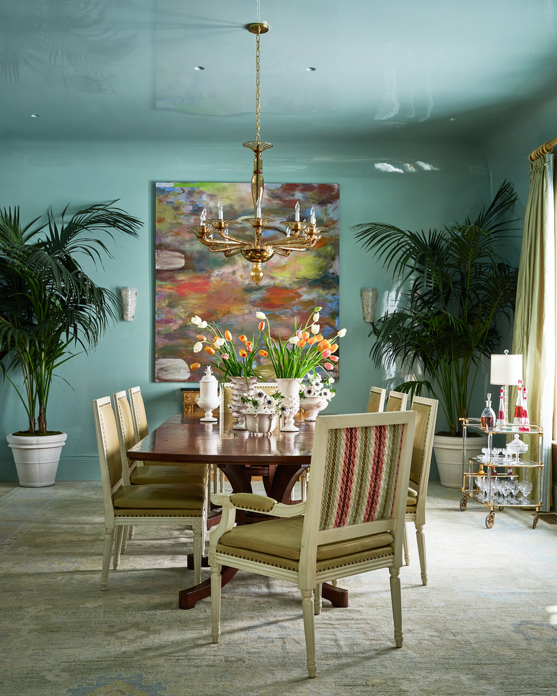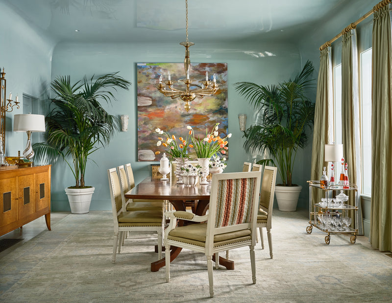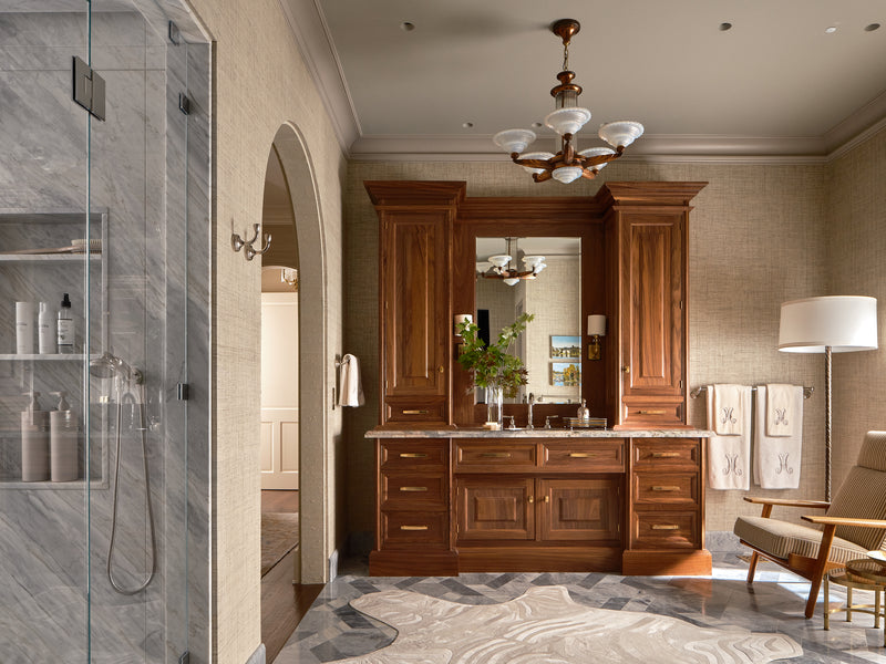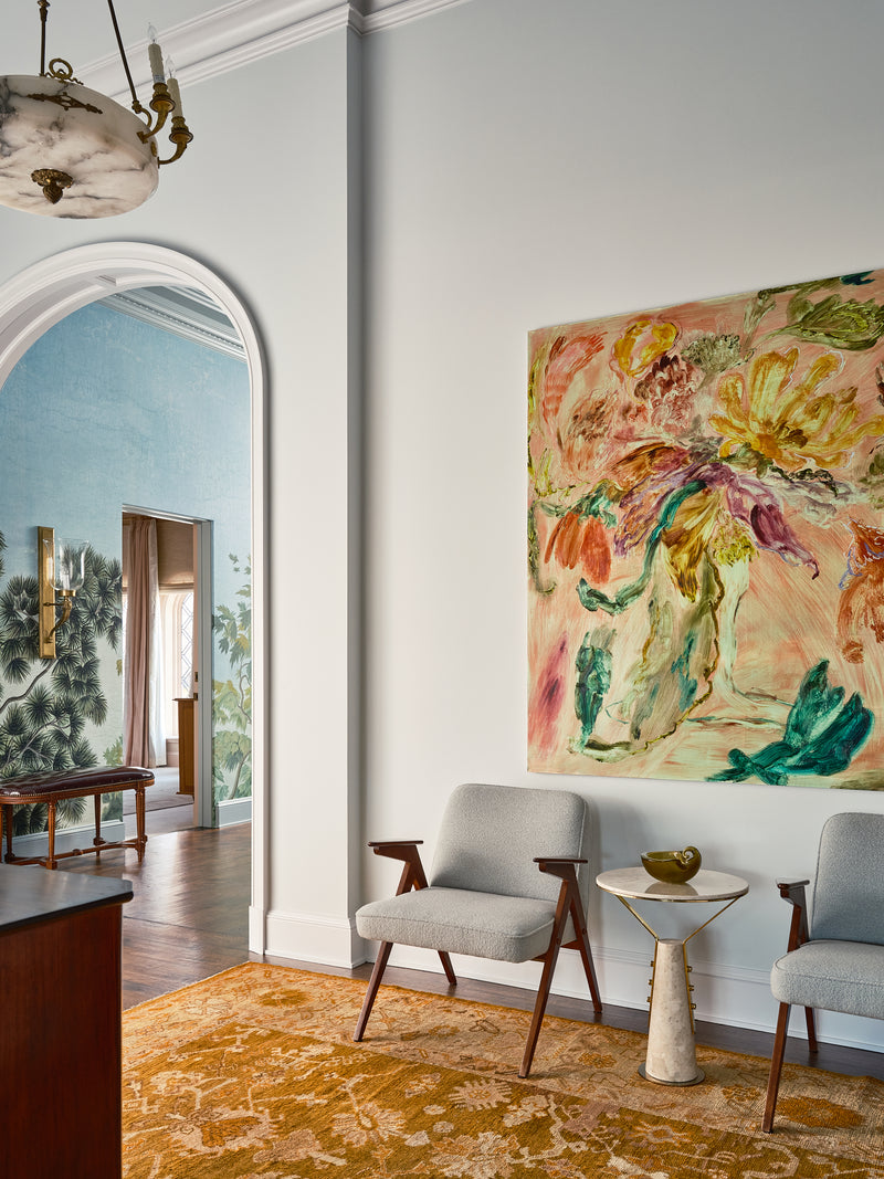 The entry is, of course, a staggering introduction, with fabulous wallpaper that reflects what you see outside. The trees draw your eye in and out at the same time. It truly doesn’t feel over-the-top. It feels enveloping, like being in nature. The property is so private and parklike, it couldn’t help but inspire and influence everything we did.