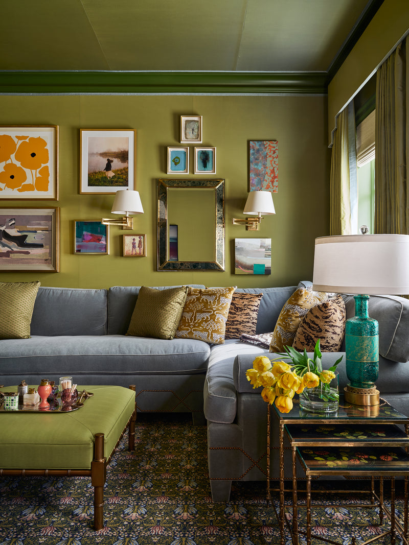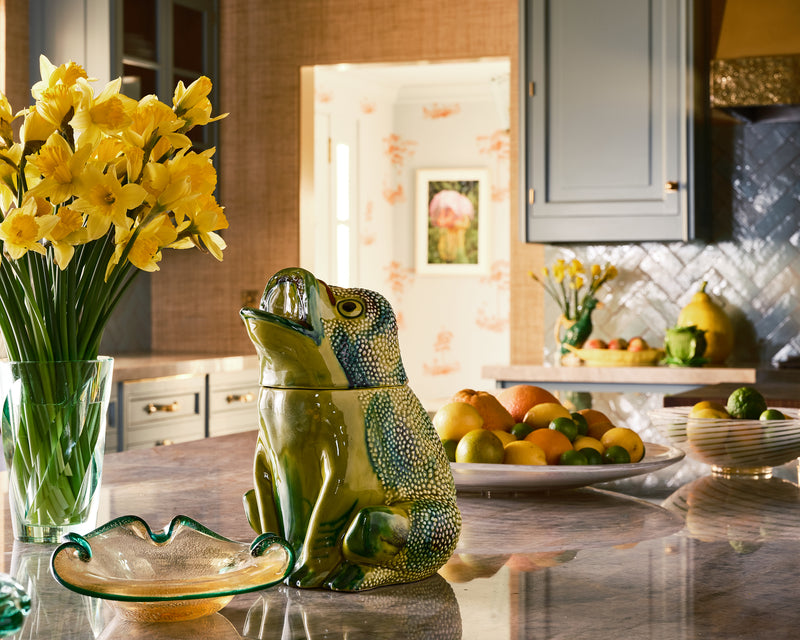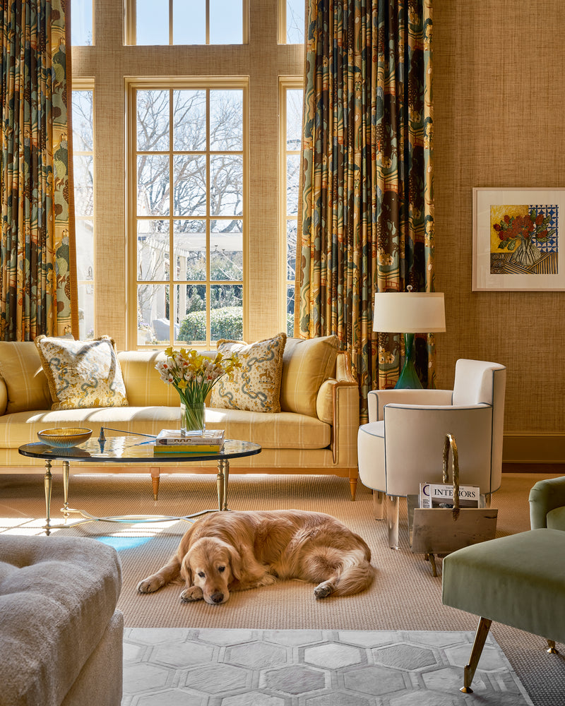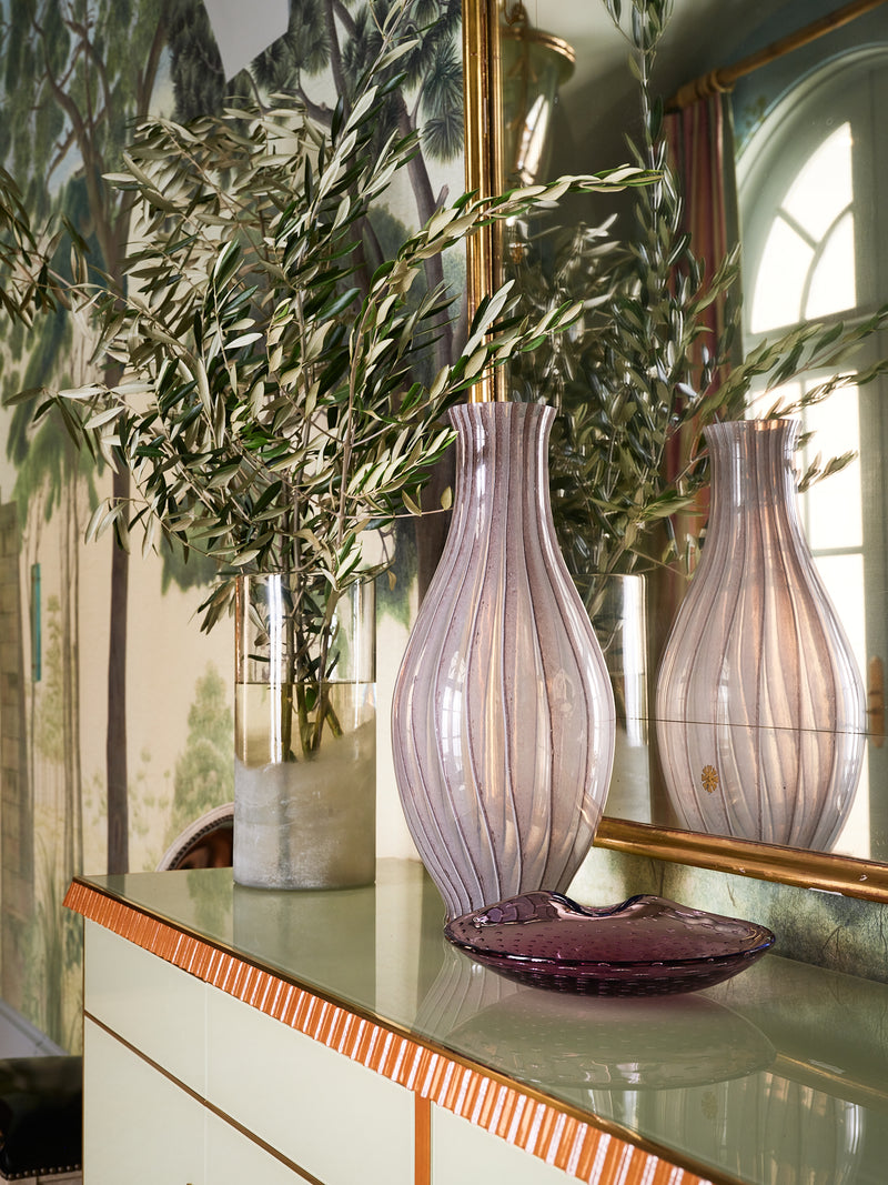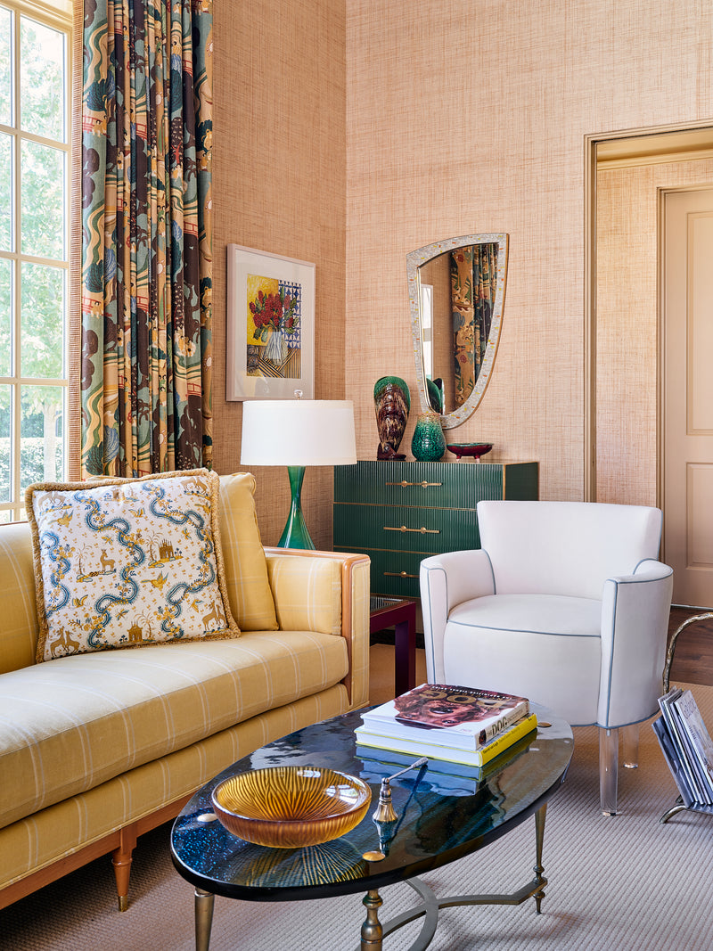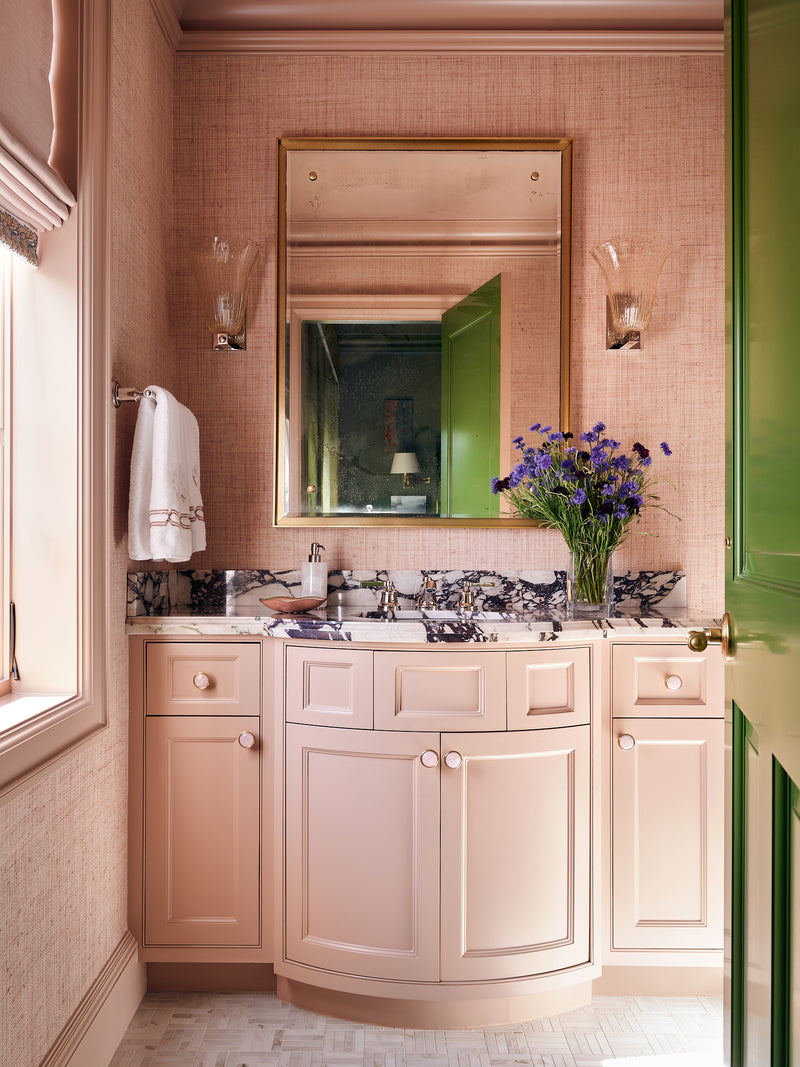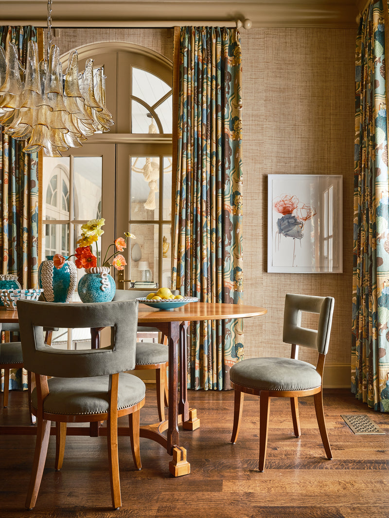 The entry is, of course, a staggering introduction, with fabulous wallpaper that reflects what you see outside. The trees draw your eye in and out at the same time. It truly doesn’t feel over-the-top. It feels enveloping, like being in nature. The property is so private and parklike, it couldn’t help but inspire and influence everything we did.
