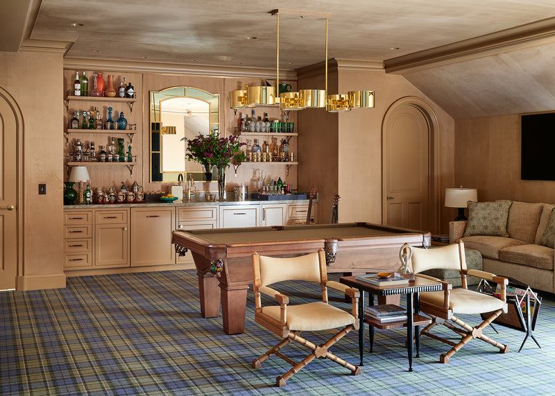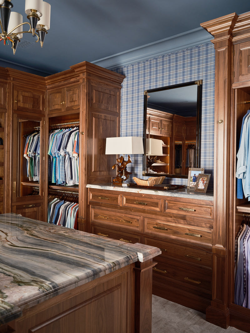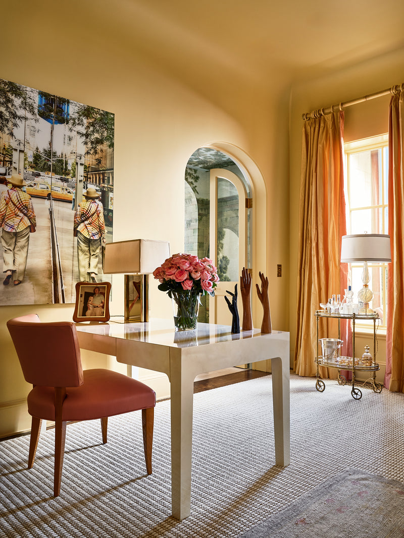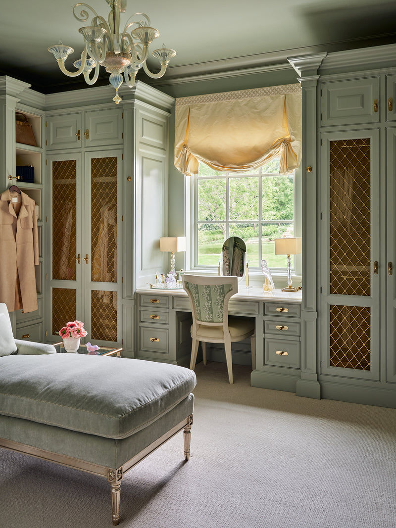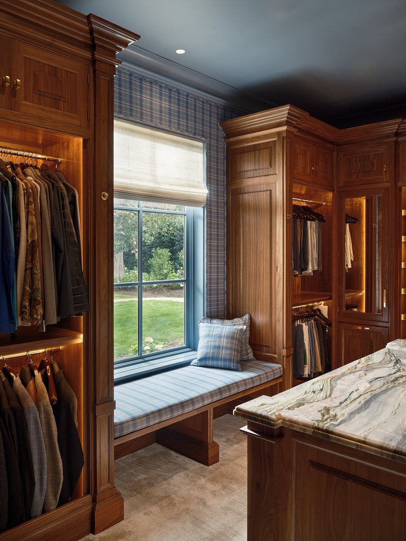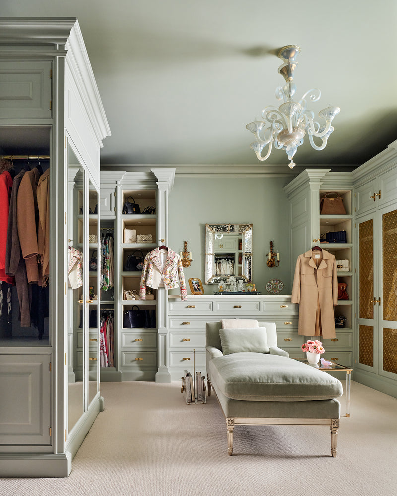Looking back on these pages, the thing that stands out most is how often these clients said yes. When we felt most creative and excited, they were trusting and open, giving us every chance to explore print, patterns, and color. It was incredible how often they encouraged us to take an idea further. Just look at her dressing room if you don’t believe me. I think it’s the most fun I’ve ever had in a closet. You rarely have clients who will let you take it this far. We designed it with Christopher Peacock. Totally glamorous, totally custom. Even the shelves are lined with leather.
