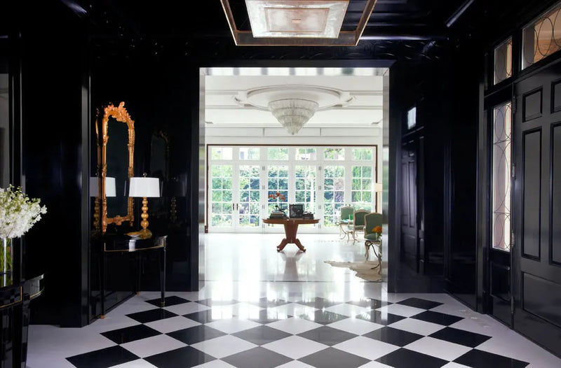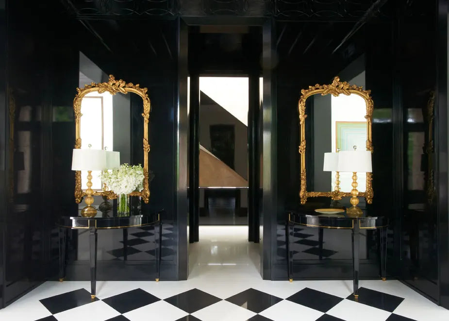 The Guest House is composed of three floors. The entrance is on the second floor. When I first saw the house, the entry hall was a combination of natural-colored wood and upholstered walls that did not enhance the beauty of the surrounding rooms, the black-and-white stone floor, or the stunning black lacquered staircase visible in the next room. I felt strongly that the walls and ceilings needed to be lacquered black for dramatic effect, and to set off the beauty of the galleries on either side. I presented the idea during a phone conversation, and the Bradshaws were open but wanted to see a rendering and have a section of the room painted as a test. A black panel was lacquered and hung in the entry, and the rendering was completed, upon which they were fully on board. The results are splendid.