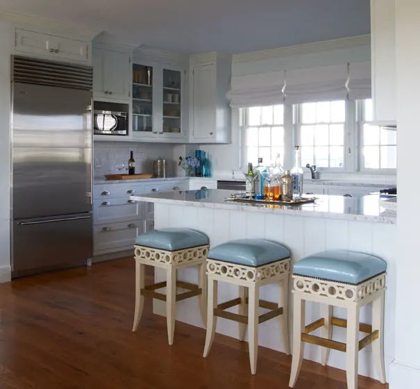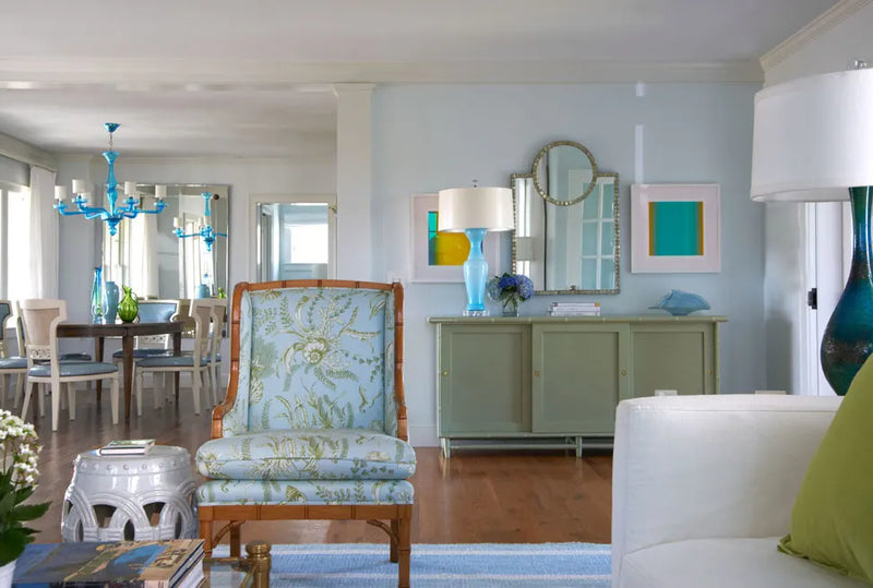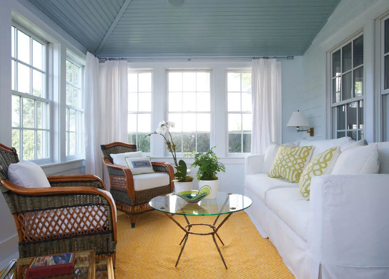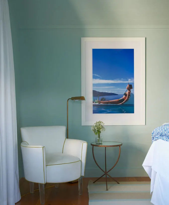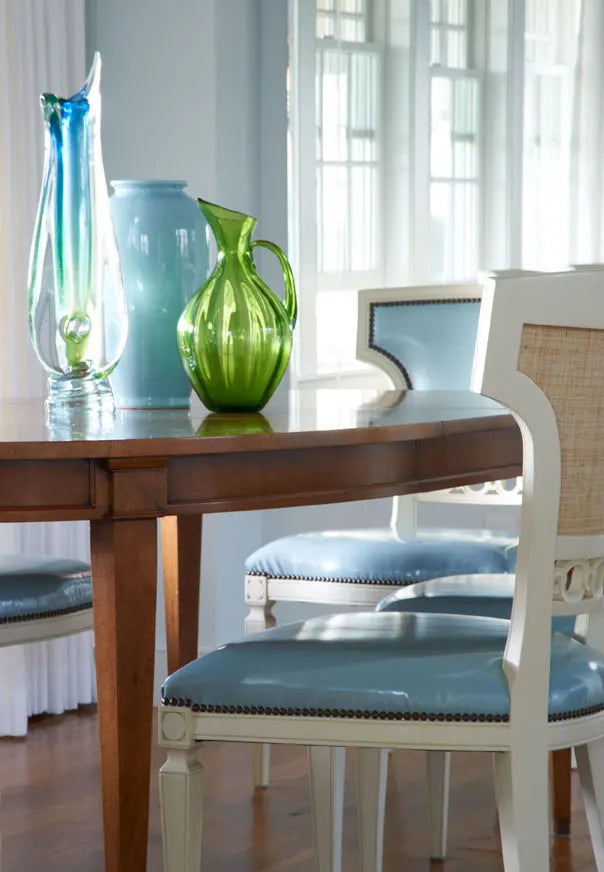 The Jan Showers team found the bronze and glass coffee table in Paris on a buying trip months earlier, finally arriving just a day or two before the clients came to our interior design showroom to make selections. Kismet inevitably plays a tremendous role in every interior design project. The antique table is a chic addition that transforms the design and feeling in the room, adding character as all coffee tables should, but also bringing an element of glamour to their interior space. As for the walling haning art over the fireplace, our client selected Slim Aarons’ photograph, titled Poolside Gossip, rather than the usual sand-and-sea scenes. Aarons’ photography can be found throughout the house. The dining room is adjacent to the living room, and we made the decision not to use a rug, in part because it is a high-traffic area, but mostly because we all loved the warm look of the exposed wood floors. The dining room is very carefully edited. An unusually wide, almost square French mirror expands the visual space and is designed to add depth to the room. This grand mirror reflects the turquoise Elizabeth Chandelier, which an unexpected piece of interior design in a Nantucket house. Six antique ivory painted Coco chairs from the Jan Showers furniture collection are upholstered in azure faux patent leather. The chairs have their backs upholstered in raffia, giving them a pleasantly casual air. Passing through the central living space one arrives in a charming, very open sun porch with a sofa and a pair of wonderful vintage French rattan-and-wicker lounge chairs, extending the interior design to their homes exterior.
