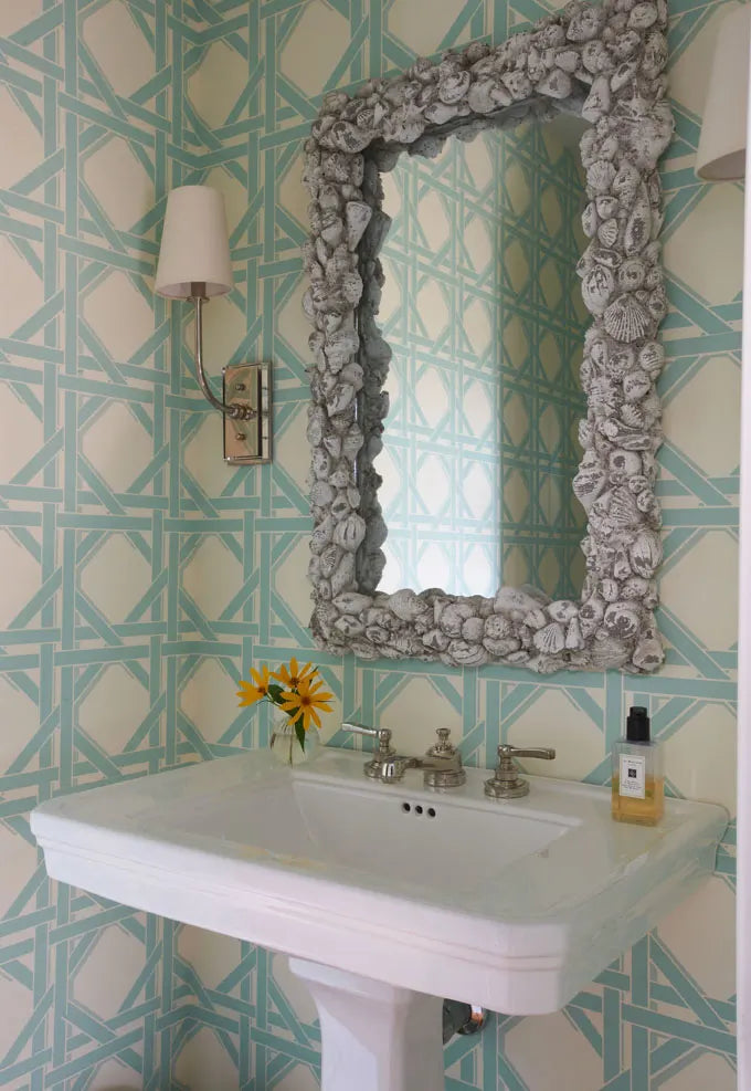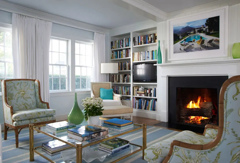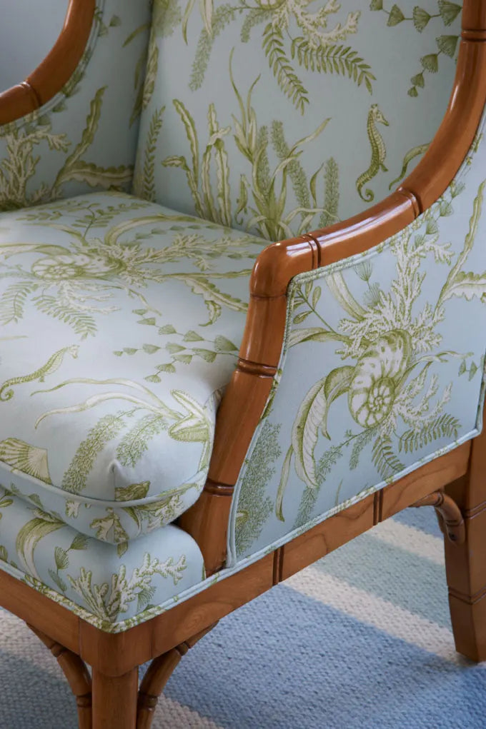 The living space off the entry is designed with a sophisticated, inviting vibe. The wool rug, the book-lined shelves, and the fireplace all create an intimate and inviting atmosphere, in any season. I particularly love the custom-size blue, sea grass, and ivory rug. It was the starting point for design for all the fabrics and textures in the room. The Jan Showers design team used a pair of faux-bamboo wing chairs, found in a vintage shop and thought looked “very Nantucket” in the best possible sense. The upholstery used in their interior design is a wonderful sea-motif toile in blues and greens. Handsome hand-thrown ceramic lamps from the 1950s lend the room a brilliant, watery iridescence. In the corner, a raffia-upholstered Louis XVI-style bergère and ottoman create an ideal spot for reading by the fire, interior design creating a tangible feeling in each room.