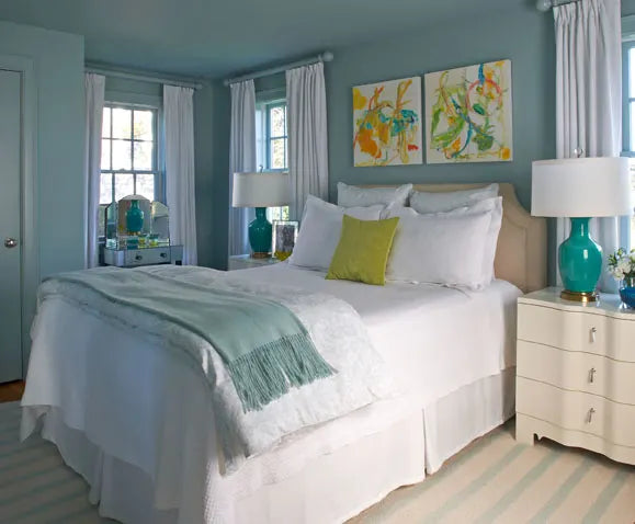 Jan Showers design touch continues upstairs, the master suite has a vaulted attic ceiling and is painted in Benjamin Moore Yarmouth Blue. Our Design team hung a white glass chandelier in the middle of the room, as Jan Showers always recommends when working with high ceilings. The second floor sitting room has some of the best ocean views in the house and serves as the main hangout for the family, where they can watch TV or just take in the view. Sisters share a bedroom just down the hall. The girls wanted the interior design of their room to express what summer on Nantucket means to them -- eating ice cream and searching for seashells.