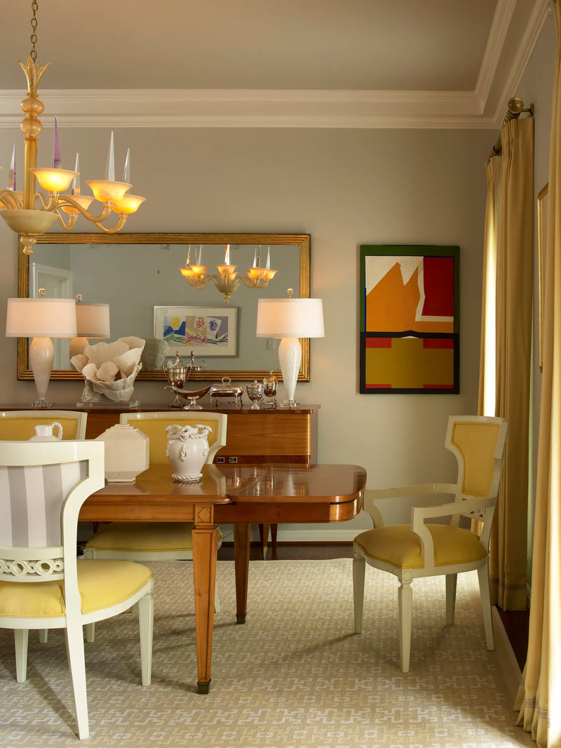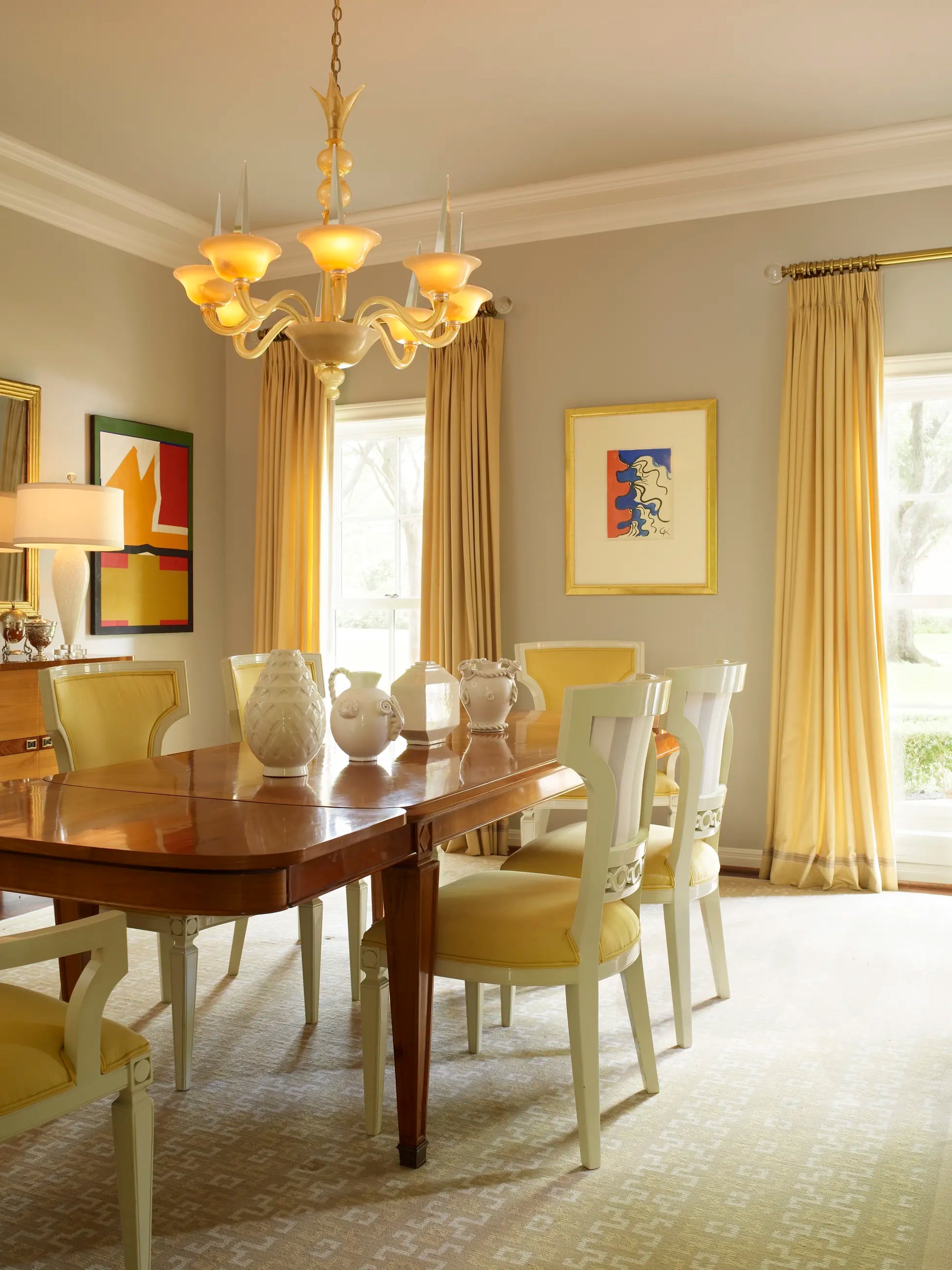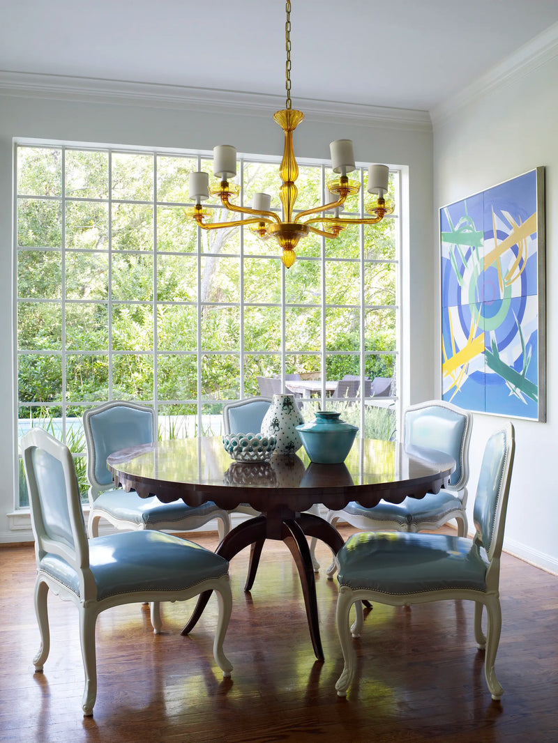 Exuberant family life informs the decor, as does the Moldawers' collection of bold art. Palmer's father, a physician, was also an artist; his modern works are interspersed with equally striking pieces by Alexander Calder, Lucio Fontana, and contemporary Texas artists. Palmer's mother was a friend of Tennessee Williams's; his works are in the collection, too. Showers tapped into the energy of the art: "I kept wanting to add more color," she says of stirring in red Murano lamps, turquoise glass vases, even the strong yellow curtains, upholstery, and Murano chandelier of the dining room. "A fun yellow," she says. "It reminds me of Susanna."