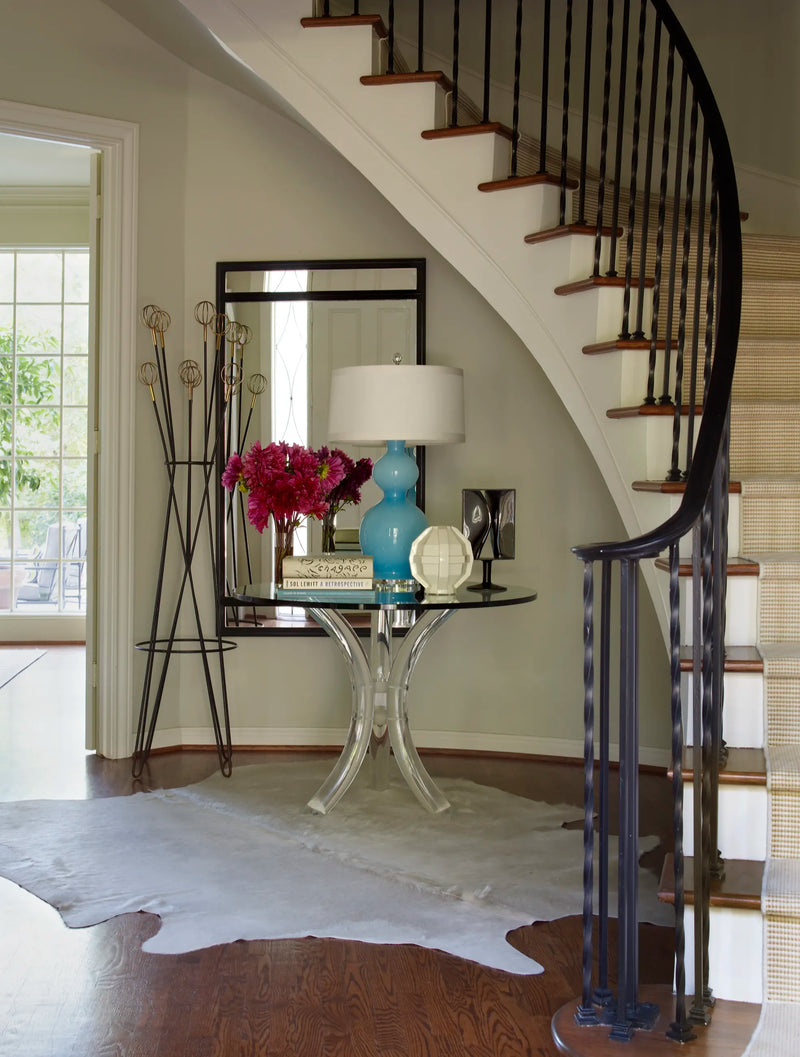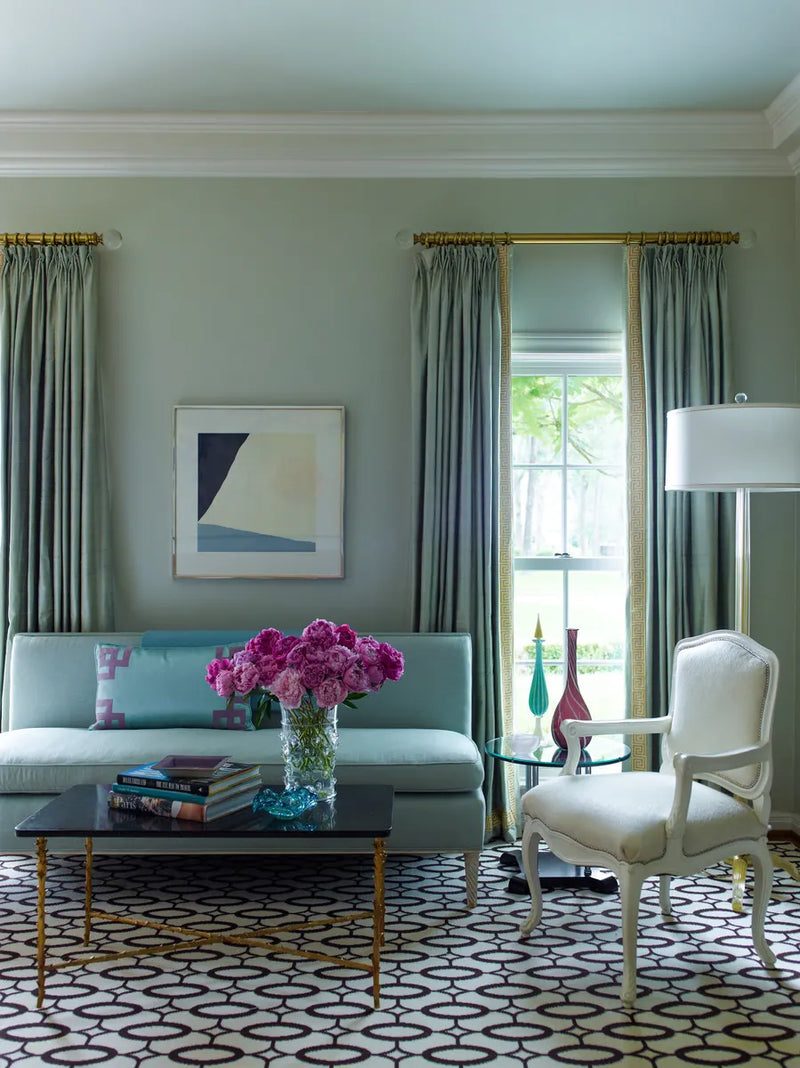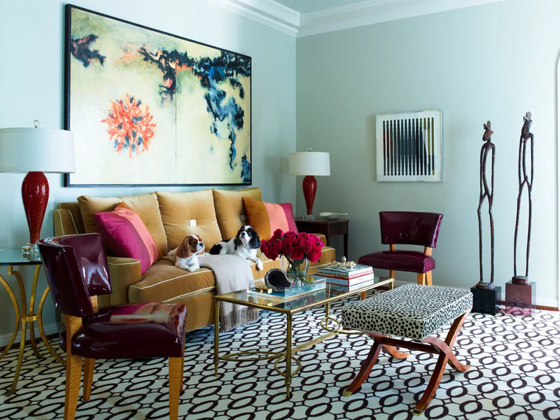 Susanna Showers Moldawer wasn't entirely thrilled with a pair of slipper chairs that had arrived for her Houston living room. The demure, 1940s French–style seats were back from the upholstery shop, where her decorator had ordered them covered in glossy patent leather, in a confident plum hue. "We had put the graphic rug in there," Moldawer says of the capacious room's dramatic Stark carpet—chocolate ellipses and diamonds linked across a field of milky white—and she wondered, were the punchy chairs too much atop all that pattern? Then, at the direction of her decorator, "We moved a painting," she says. "And now I think they look great."