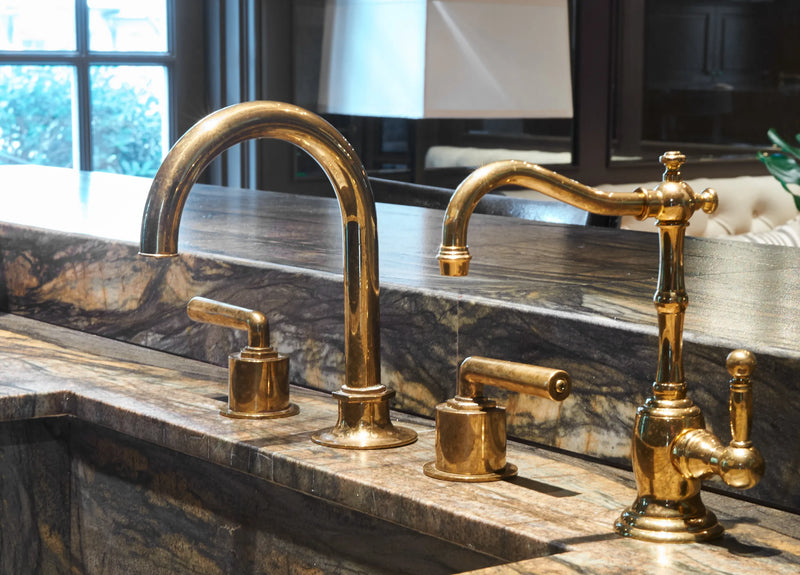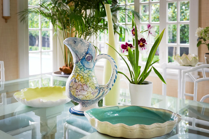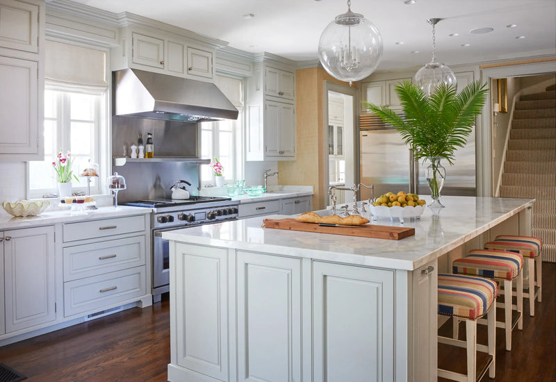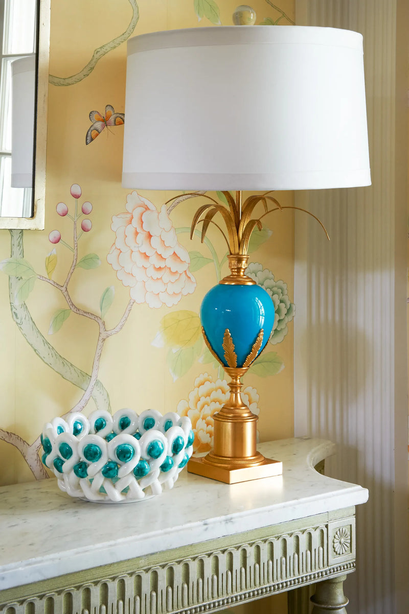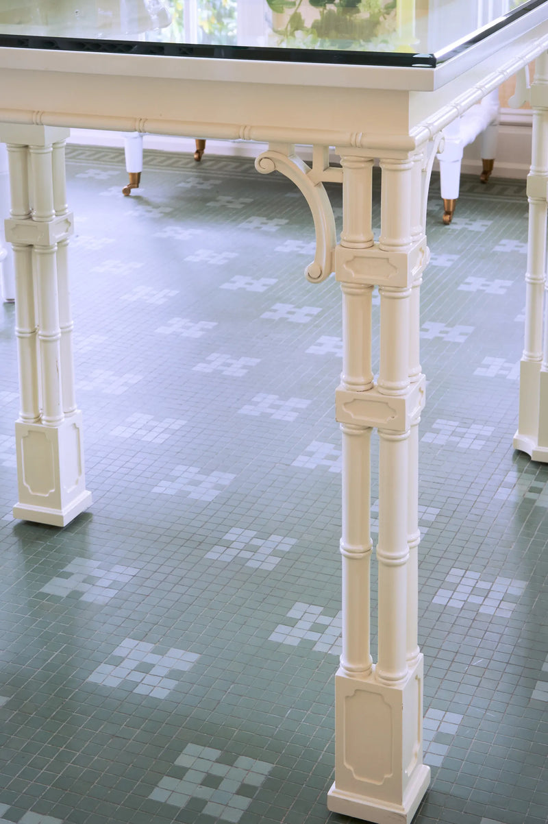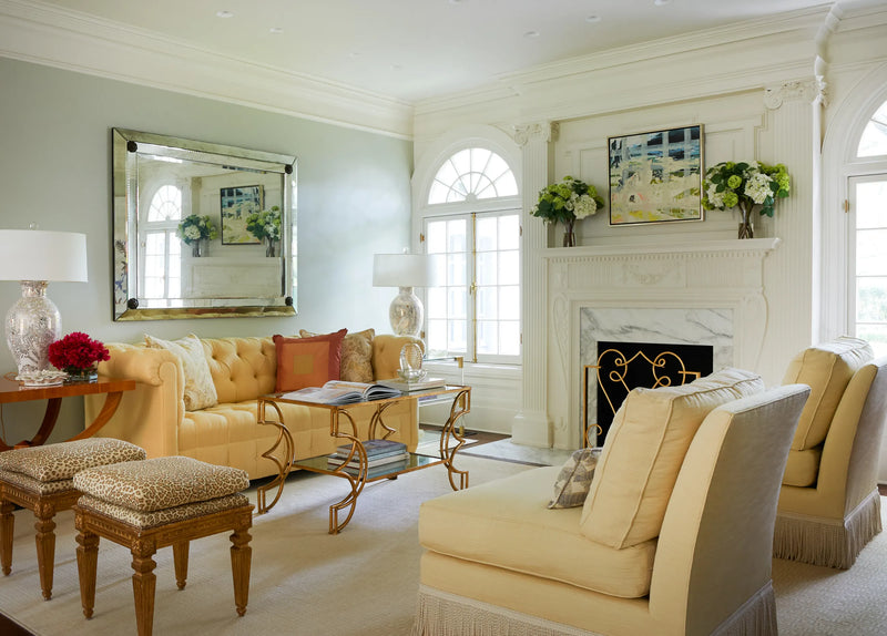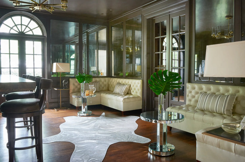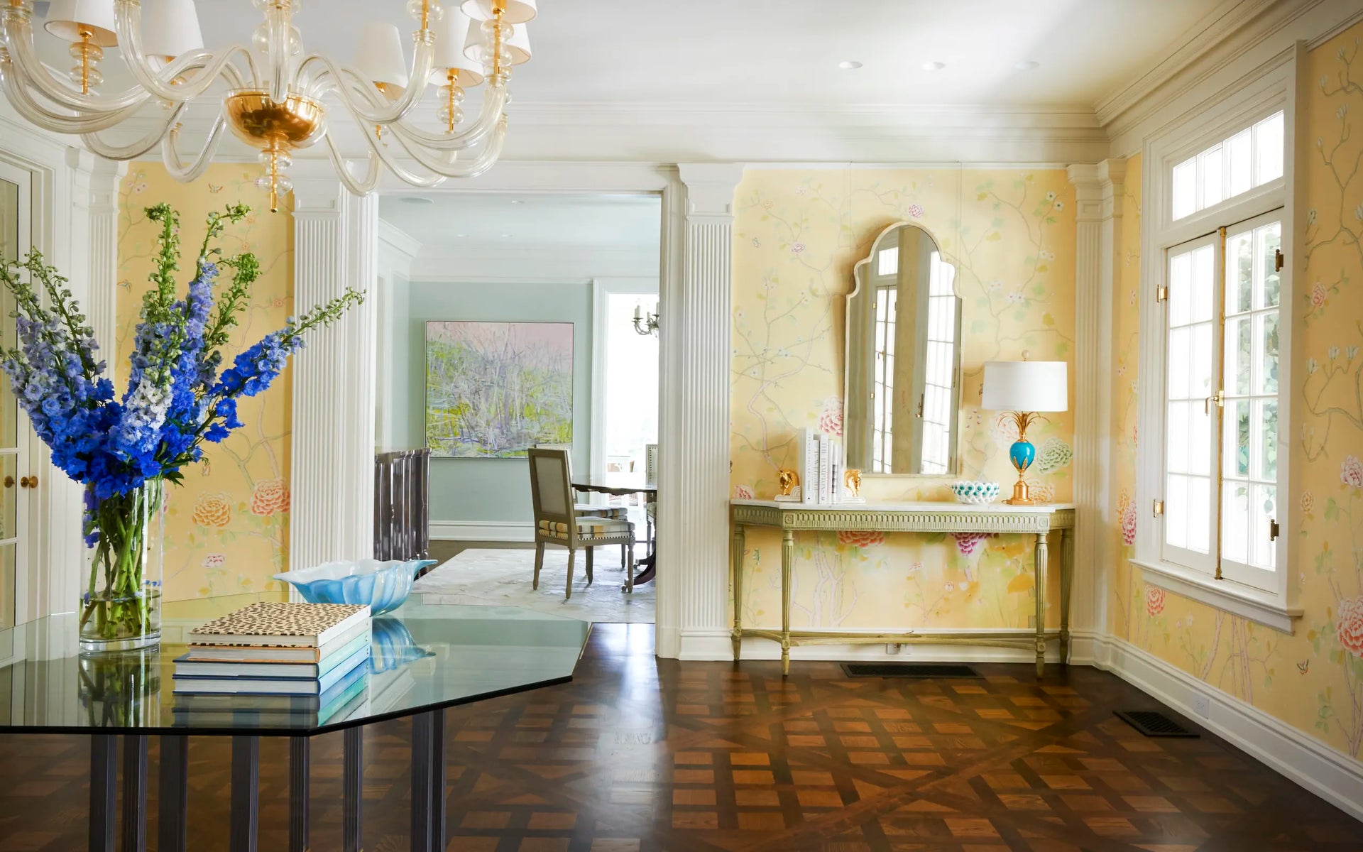 One of the small number of historic homes still in existence in Highland Park, Dallas, by Hal Thomson built in the early twentieth century. This style has been described as American Georgian. A large entry hall with walnut-and-oak parquet custom floors in this 1915 house. Dallas architect Ralph Duesing updated the home. The generous entry hall has custom hand-painted de Gournay wallpaper, vintage Louis XVI-style painted consoles, and a gold Barovier Murano chandelier. A pair of faux-bamboo painted chairs nestle into the curved stairway. A curved stairway carpeted in the Continental style in Martin Patrick Evan custom carpet. Stair retainers by Stark. The living room is large and separated into two seating areas. One side of the large living room has a lovely pair of brass-and-glass Louis XVI-style tables and a coffee table in bronze with an opaline top - all vintage from the 1940s - and the Paris Banquette from the Jan Showers Collection. The floor lamp to the right of the piano is the Capri from the Jan Showers Collection. Art by James Welling. On the opposite side of the living room are a pair of Antique French stools, ceramic lamps by Paul Schneider, a custom Chesterfield Sofa and a custom tea table in gold-leafed steel. Art by Toby Ziegler. One of my favorite rooms in the house is a chocolate-brown bar with a custom banquettes in ivory-tufted leather and is perfect for entertaining. The solarium in this house is now used as the family's casual dining room with chairs for reading and lounging. The wallcovering is by Phillip Jeffries. Outside the lush gardens and statues bring the inside out.