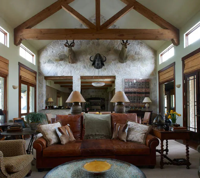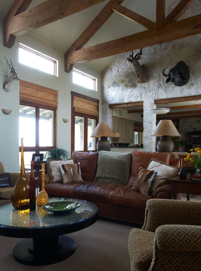 Architect John Pankratz was already well into the design process when I was first brought on board. For these clients it was important that their ranch house serve not only as the heart of a working ranch but also as a place to entertain in close proximity to the city. One of the first details I remember about the ranch project was that I arrived at the client’s house in Dallas and saw a room filled with exotic game heads. The husband is a big-game hunter, and the couple goes on safari almost every year. Many of the mounted heads would be used in our final design. There is something truly striking and magnificent about the heads, and I never objected to including them in the design.