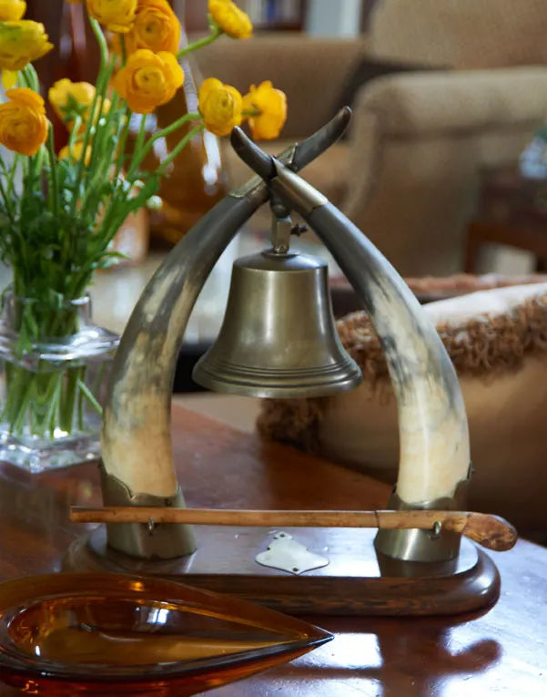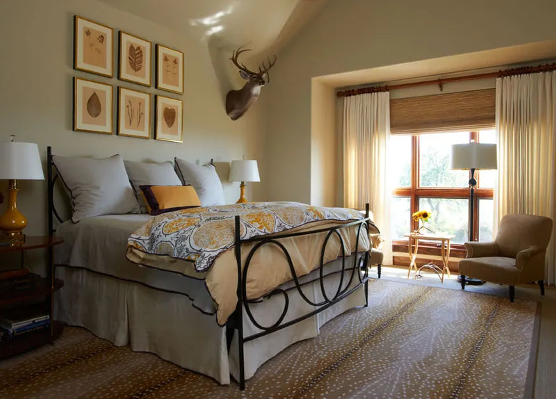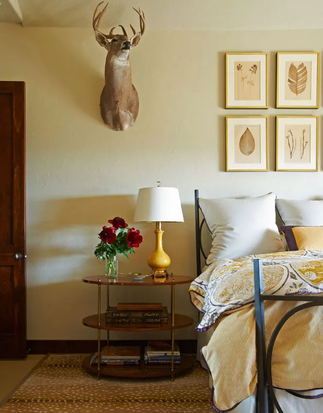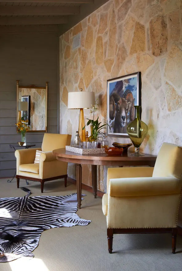 The clients later added an additional master suite on the other side of the house, with an added loggia leading to the new suite. I happened upon a beautiful French cerused demilune and I knew it was perfect for this location. It is flanked by a pair of bergères upholstered in buttercream velvet, which play beautifully against the stone wall. I love the sparkling decanters on a tray against the rock. It’s a great example of the kind of contrasts that always interest and excite me. The new master suite has incredible views of the rolling hills the house overlooks. We repeated the antelope rug from the other master suite and used an iron bed the clients already owned. We designed new bedding and used ceramic butterscotch bedside lamps on either side of the bed. Of course, two animal heads made it to this part of the house as well!