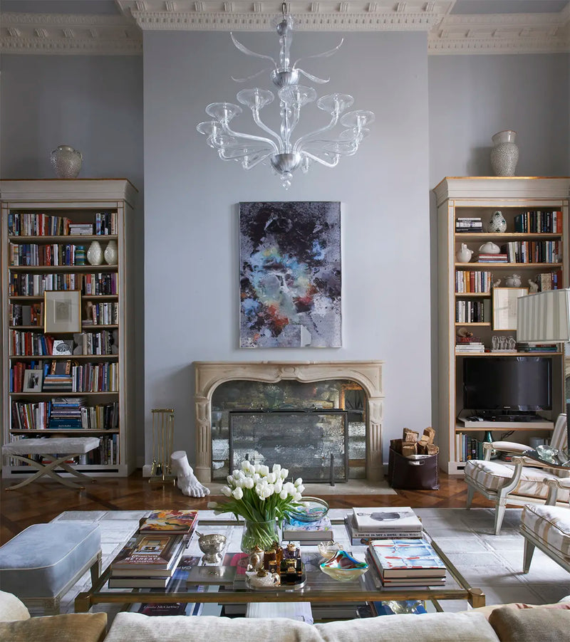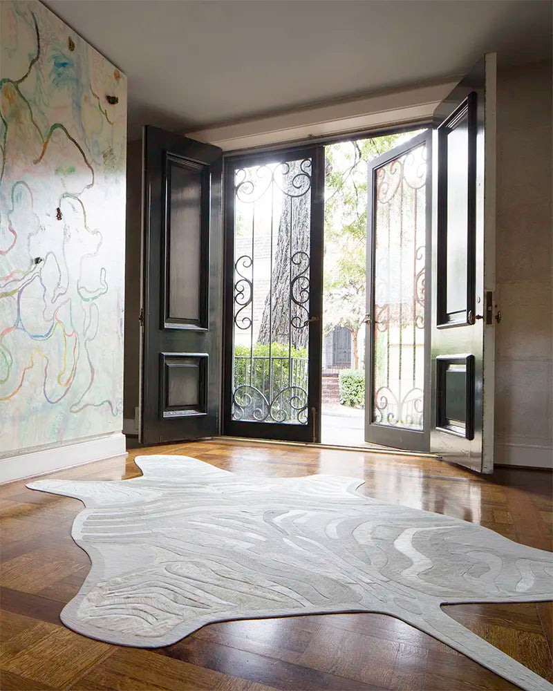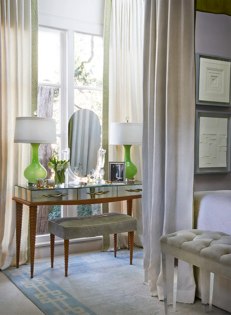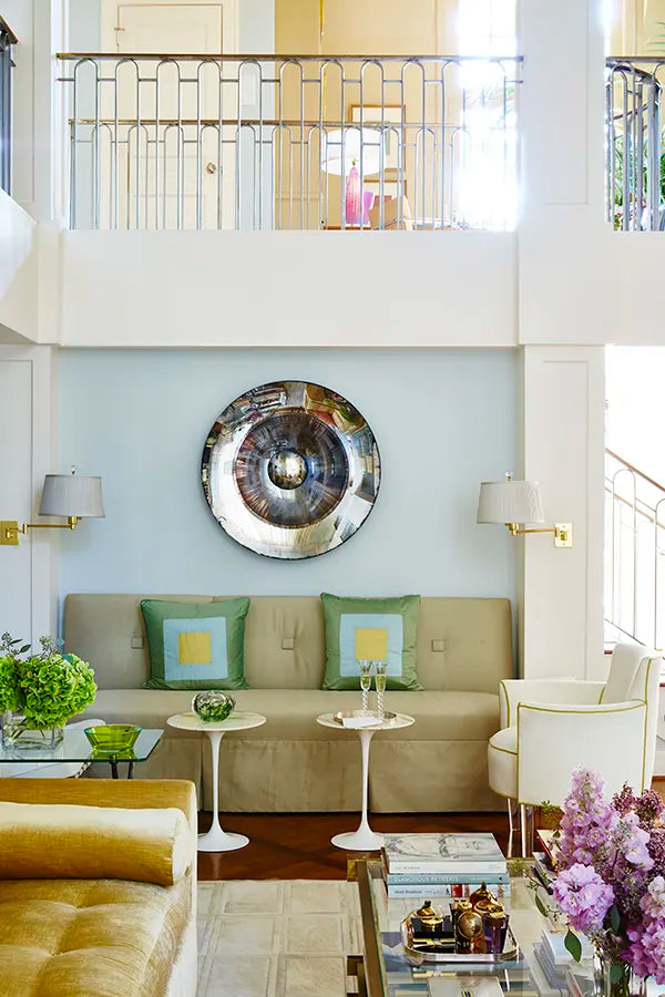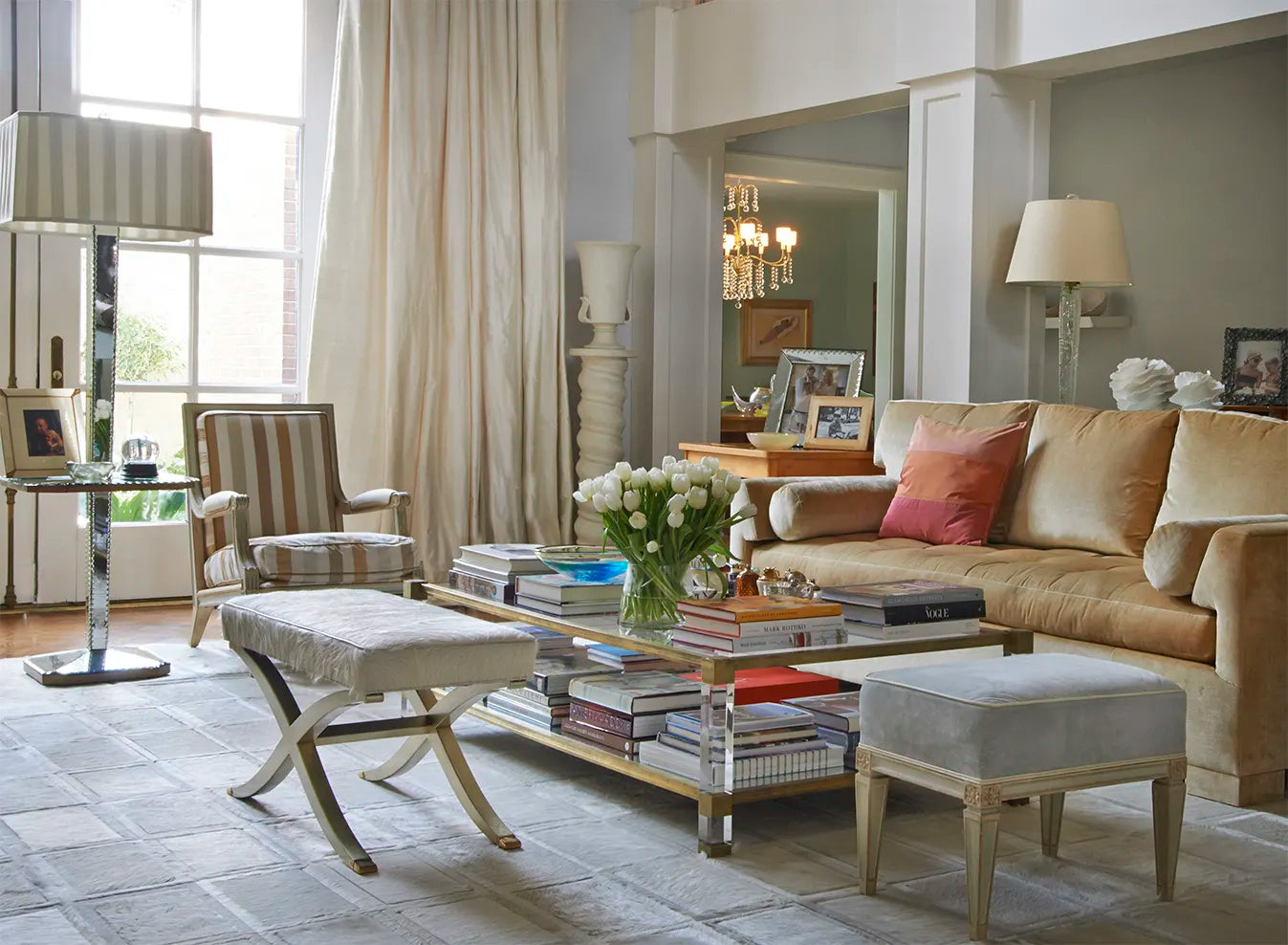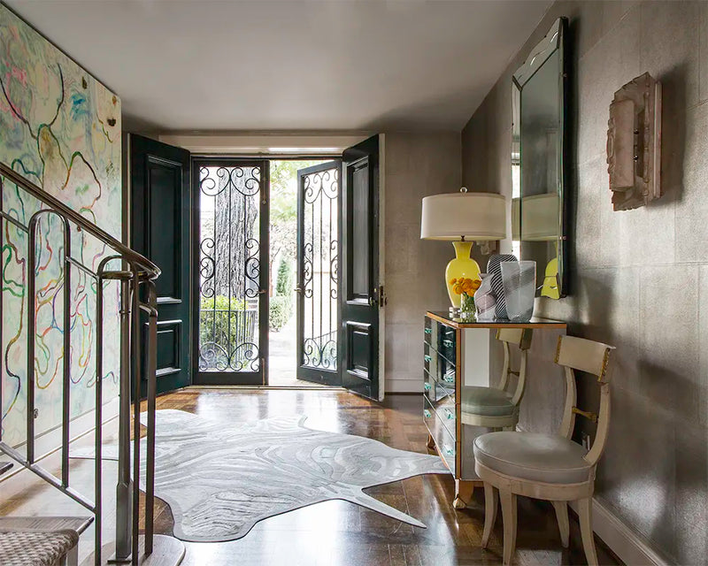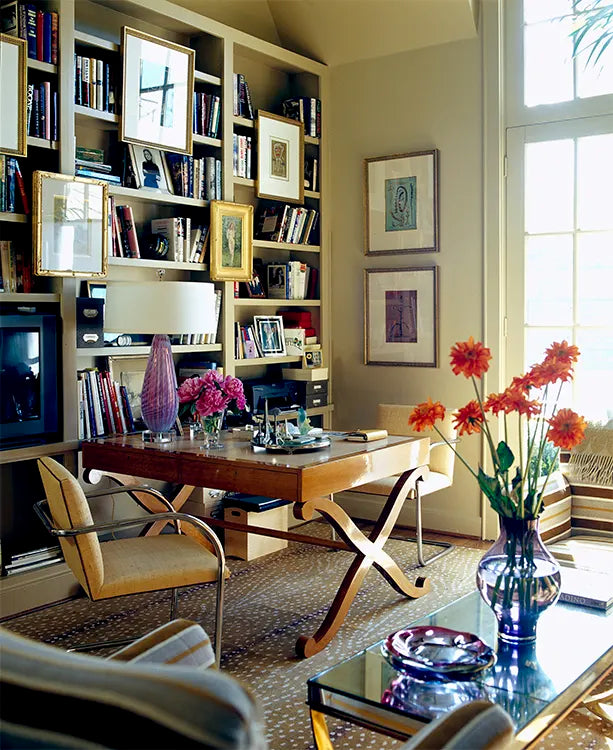 Showers renovated and decorated the townhouse before they moved into it in 2001. Their home is filled with everything Jan loves, from mid-century modernism to French design from the 1940s. Showers' home has several of the first pieces created for her to-the-trade collection, the Jan Showers Collection. Jan has an eye for antiques and has been acquiring pieces from her trips to Europe for the past 20+ years. Her favorite room in the house is their master bedroom which is done in de Gournay’s willow wallpaper.