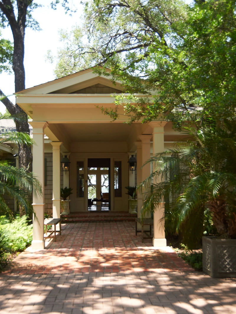 This house is positioned in an ideal spot at the end of a private road. Gardening is a genuine passion for Betty Ray, and it shows in the grounds of the property, where the landscaping is beautifully manicured. A pair of exotic palms flanks the covered entrance.