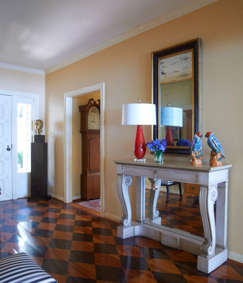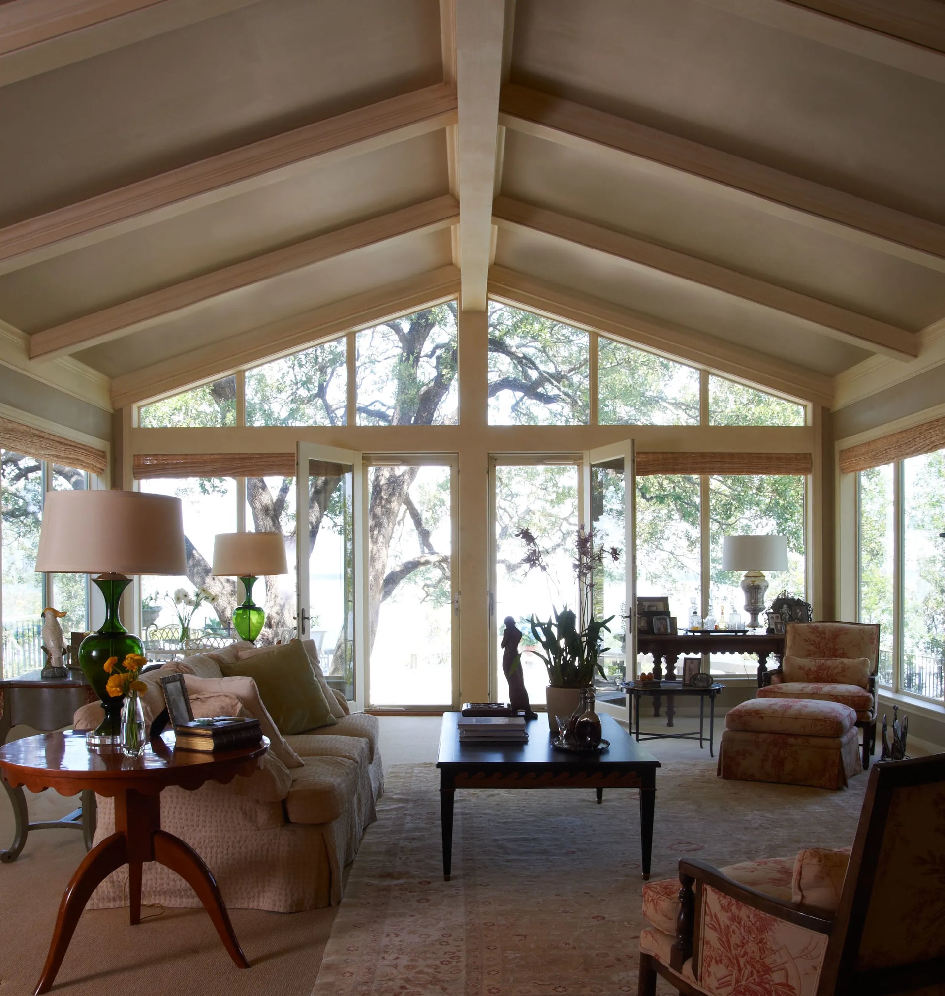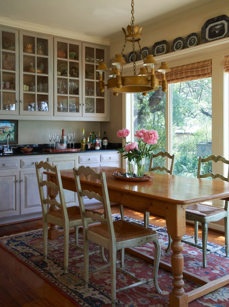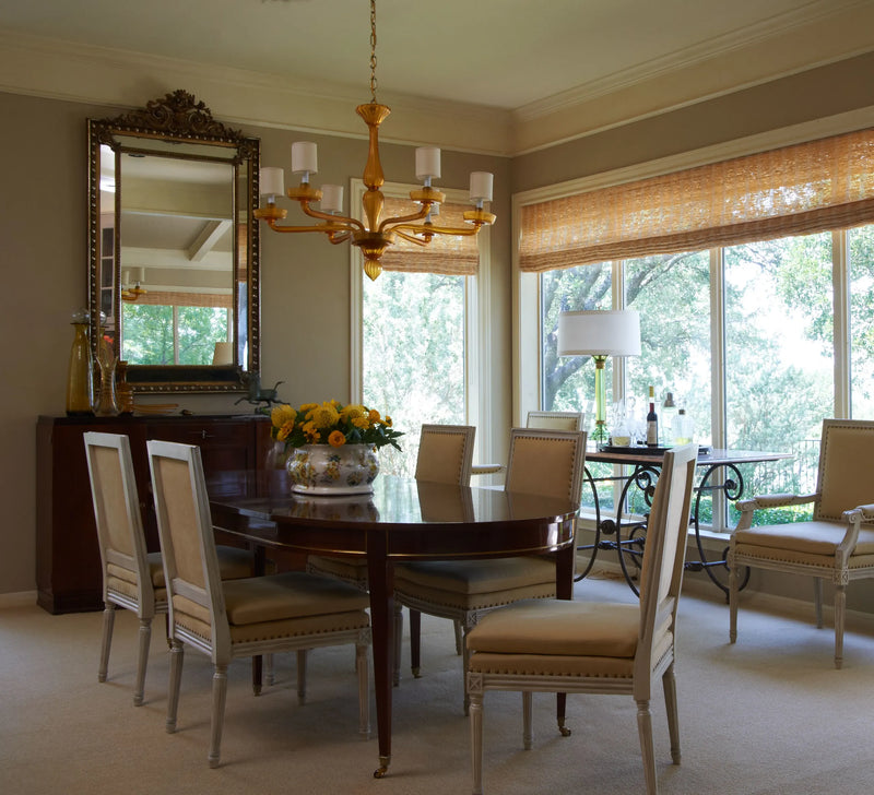 The entry hall is painted a soft, golden yellow. Faux-parquet painted and stained wood floors create visual interest, lend old-world charm, and make a great first impression that draws you into the space. Along with Majolica parrots from Betty Ray’s extensive Majolica bird collection, a bright red Murano glass lamp sits on a nineteenth-century painted French console I found in Paris. Off the entry, steps lead down into the vast living space, with a glass wall overlooking a grove of live oak trees, indigenous to the area and abundant on the property. Beyond them, the lake is visible. Doors open onto a large deck from which the breathtaking vista is even easier to enjoy. The living room is inviting with its slipcovered sofas and comfortable chairs. In accessorizing, we selected grass-green Marbro Murano glass lamps, as well as a softly colored Oushak rug. Adjacent to the living room, the dining room shares the same sensational, view. The French table is nineteenth-century Louis XVI style with custom Antibes Chairs upholstered in faux suede for practicality. An amber Murano chandelier called the Elizabeth, from my furniture and lighting collection, adds brilliance and a reflective quality to the room. A marble-topped baker’s table near the window is absolutely charming. For that spot we found another grass green Marbro Murano lamp—this one in a fabulous column design—to which we added a custom shade, base, and finial. A collection of amber Murano glass sits atop the late-Deco buffet complementing the late nineteenth-century water-gilt mirror.