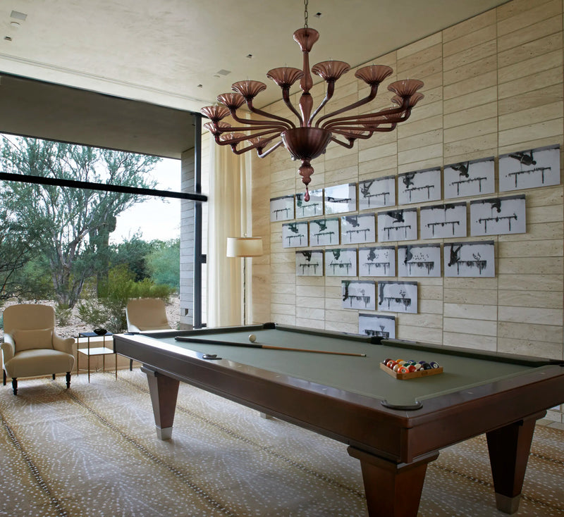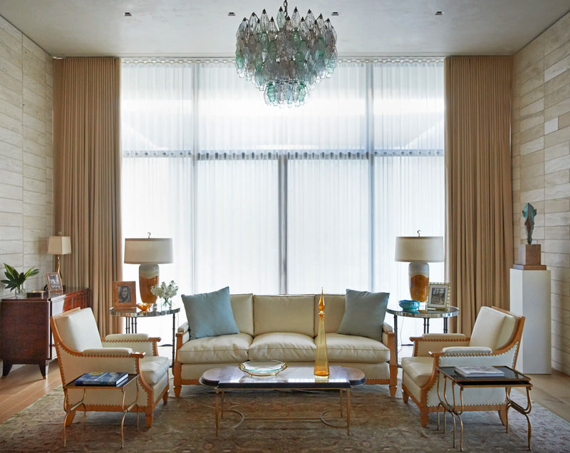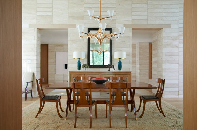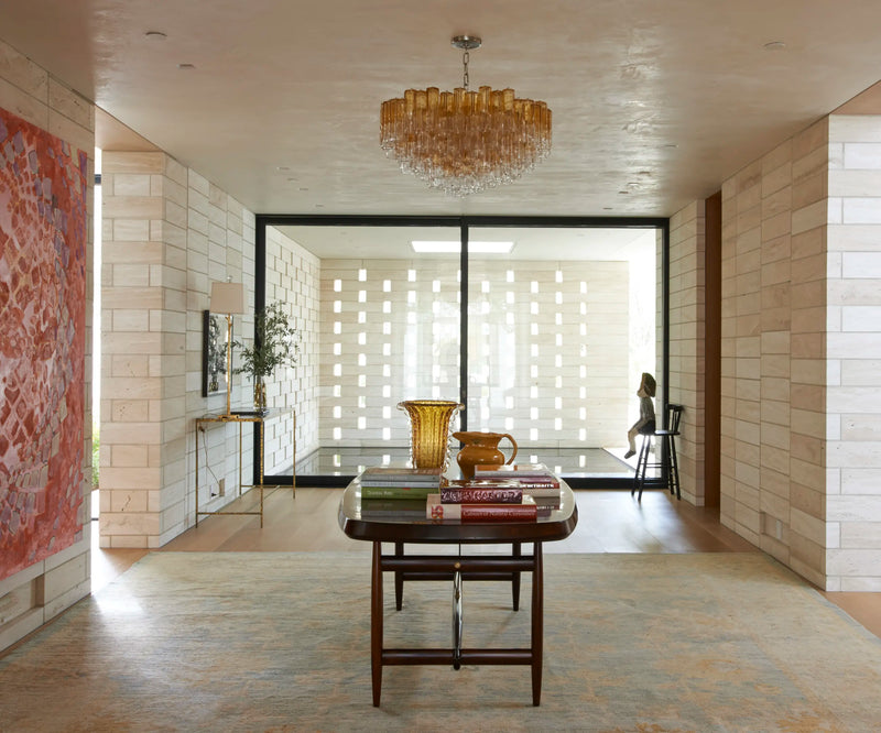 Jan Showers imported chandeliers for use throughout the interior design of the house, purchasing each in Europe. Many of the vintage chandeliers were purchased from Marc Heiremanns, who is a foremost expert and dealer in vintage and antique Murano glass. The antique glass is a welcome juxtaposition to the stone walls and the soft texture of the rugs. The sculptural brass chandelier in the dining room is truly a masterpiece by Van Heeck that the Jan Showers team found in Paris.