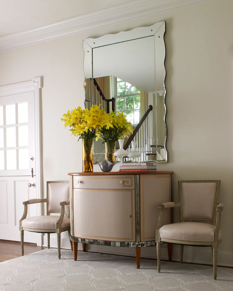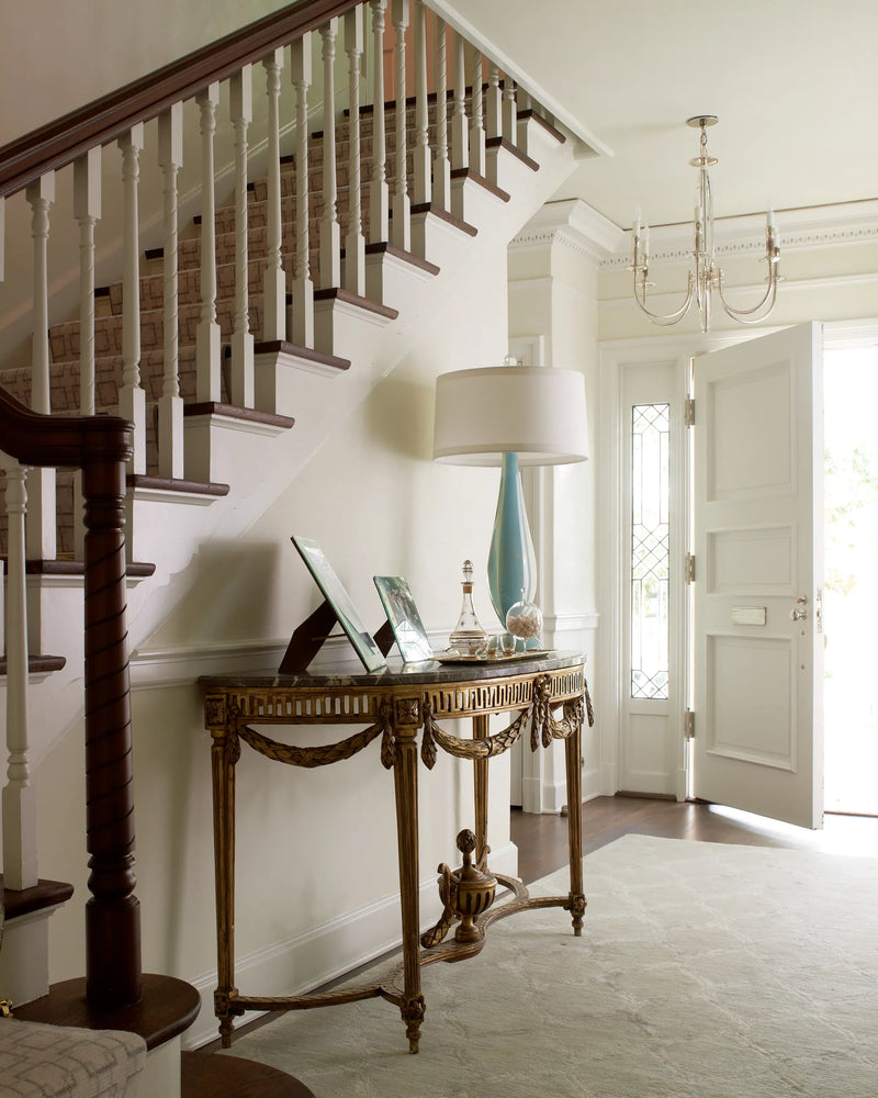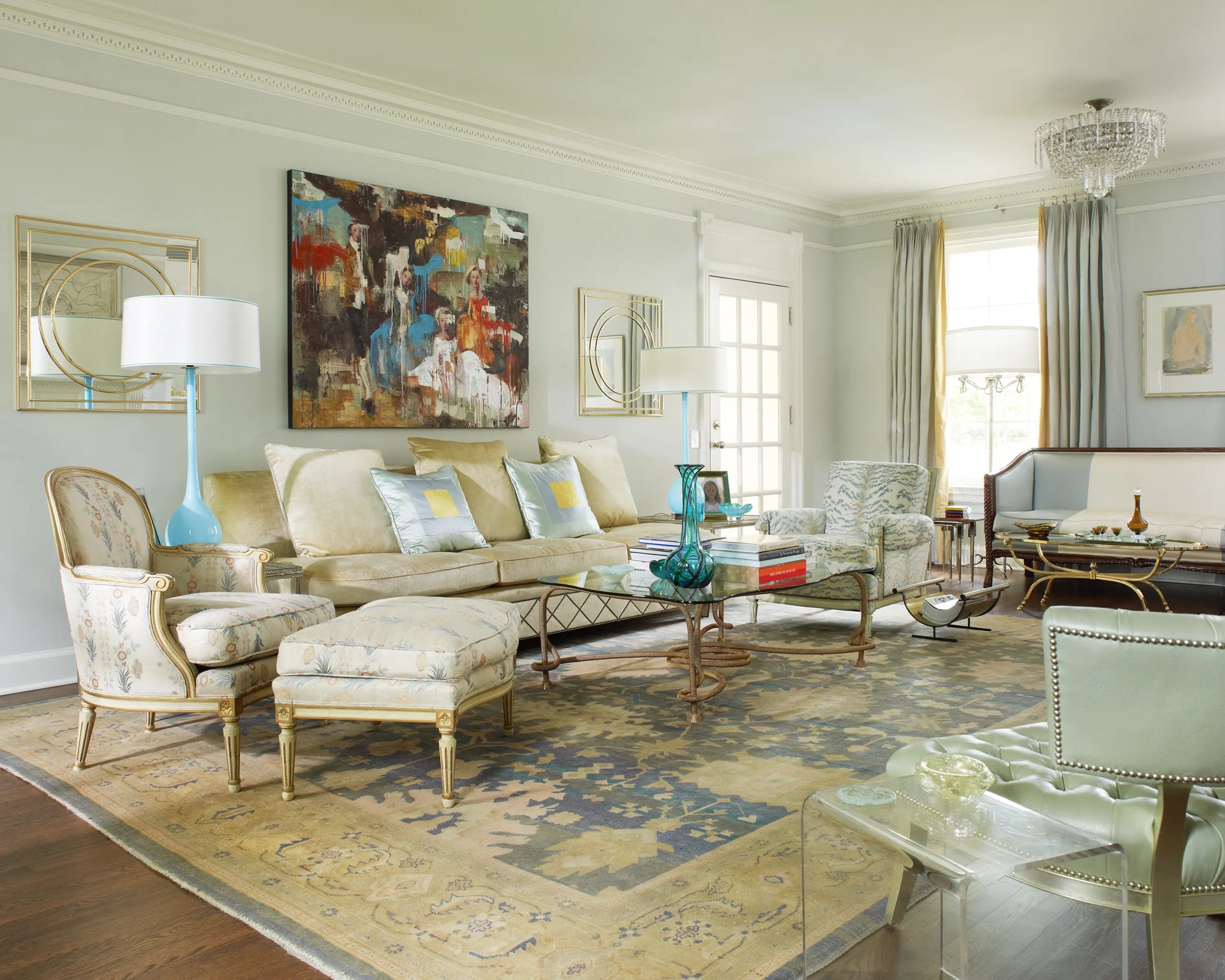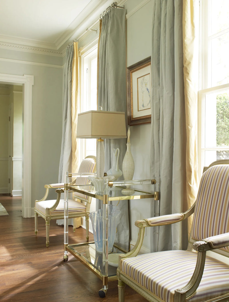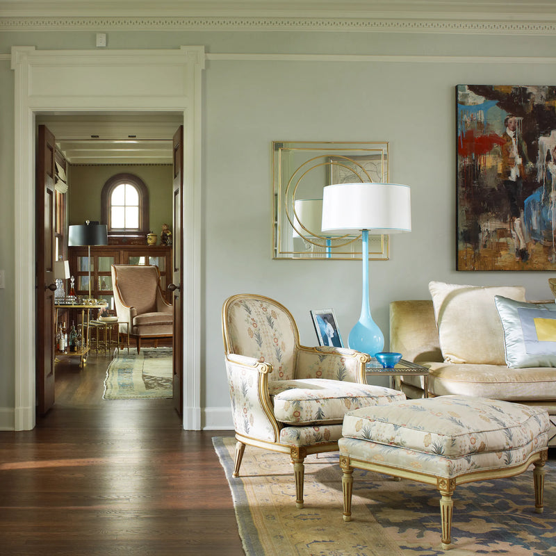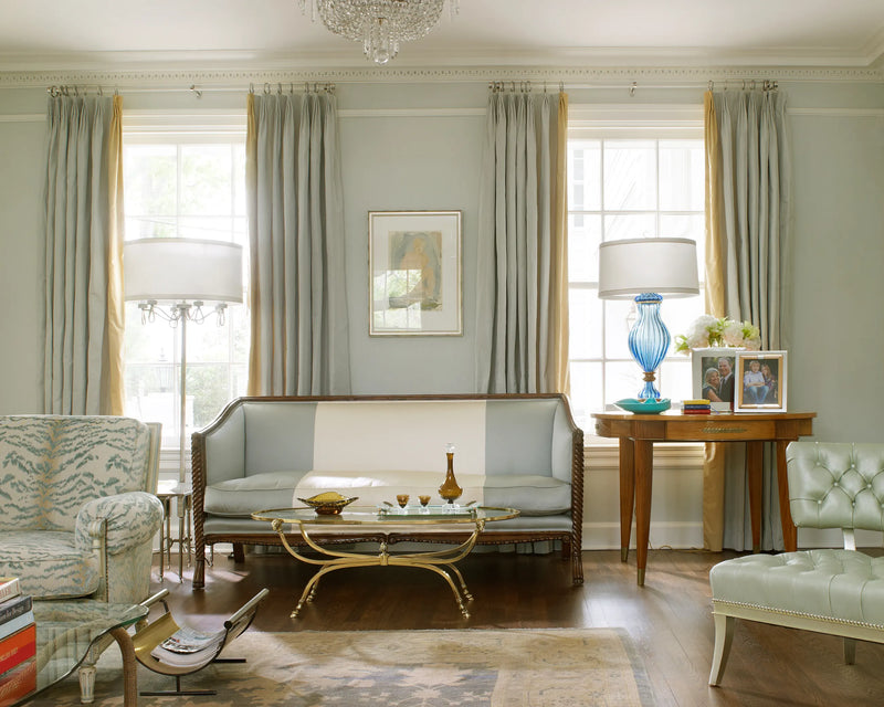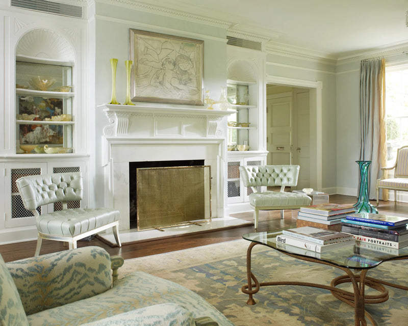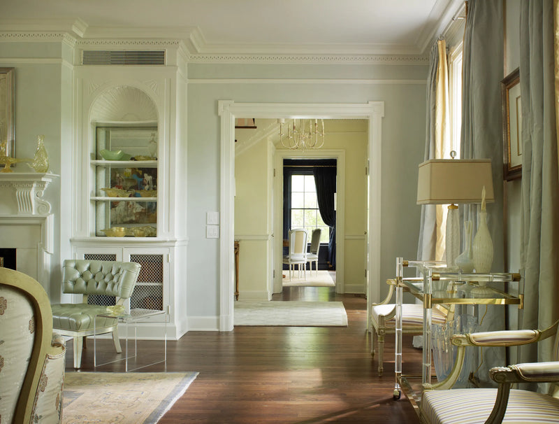 But while the architecture may be restrained Georgian, inside the Wests sought neo-glamour all the way. To give the interiors the spark she was after, Sherri looked to Dallas designer Jan Showers, whose book, Glamorous Rooms, she had been poring over. “I’ve always loved the Old Hollywood style, and I felt like it was what the house might have originally looked like inside,” says Sherri. Inspired by the living room’s existing platinum blue Venetian plaster walls, previously done by Austin interior designer Roy Materanek of RWM Design, Showers created a palette for the house comprising Sherri’s favorite colors—blue, green and cream—in pale, muted tones.