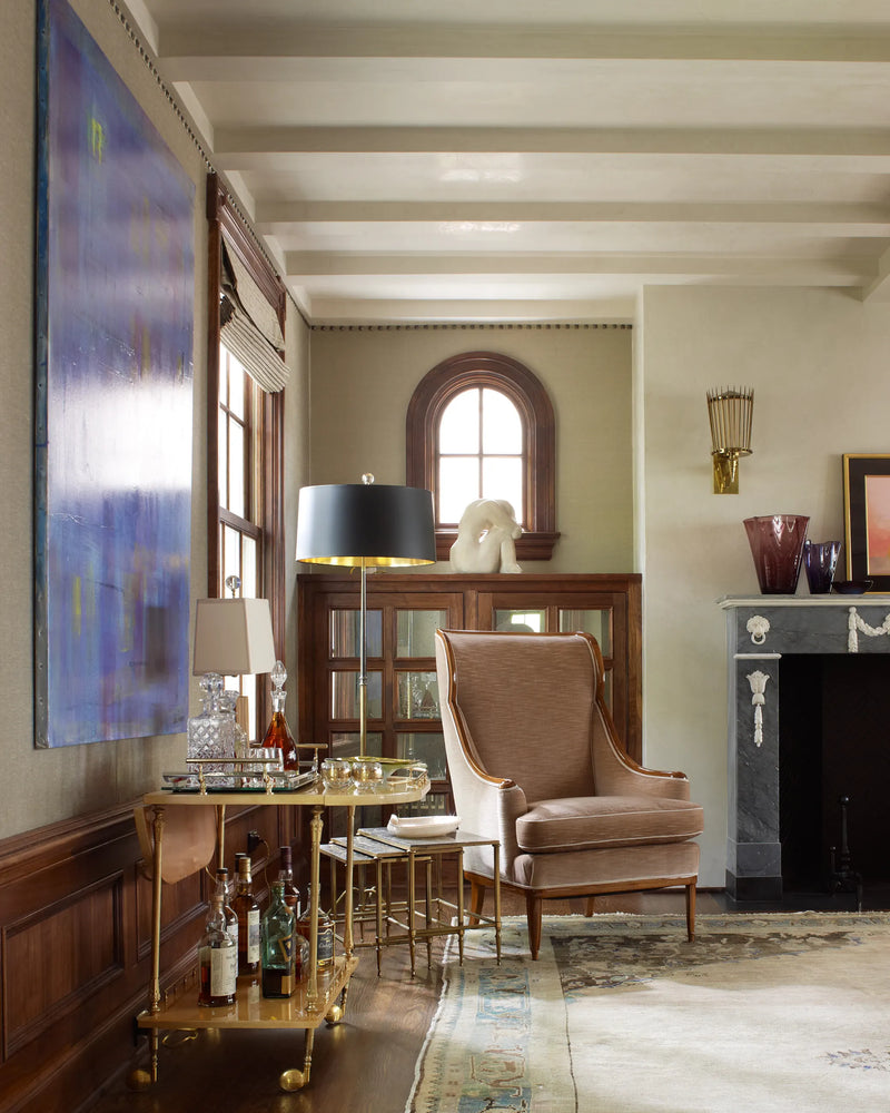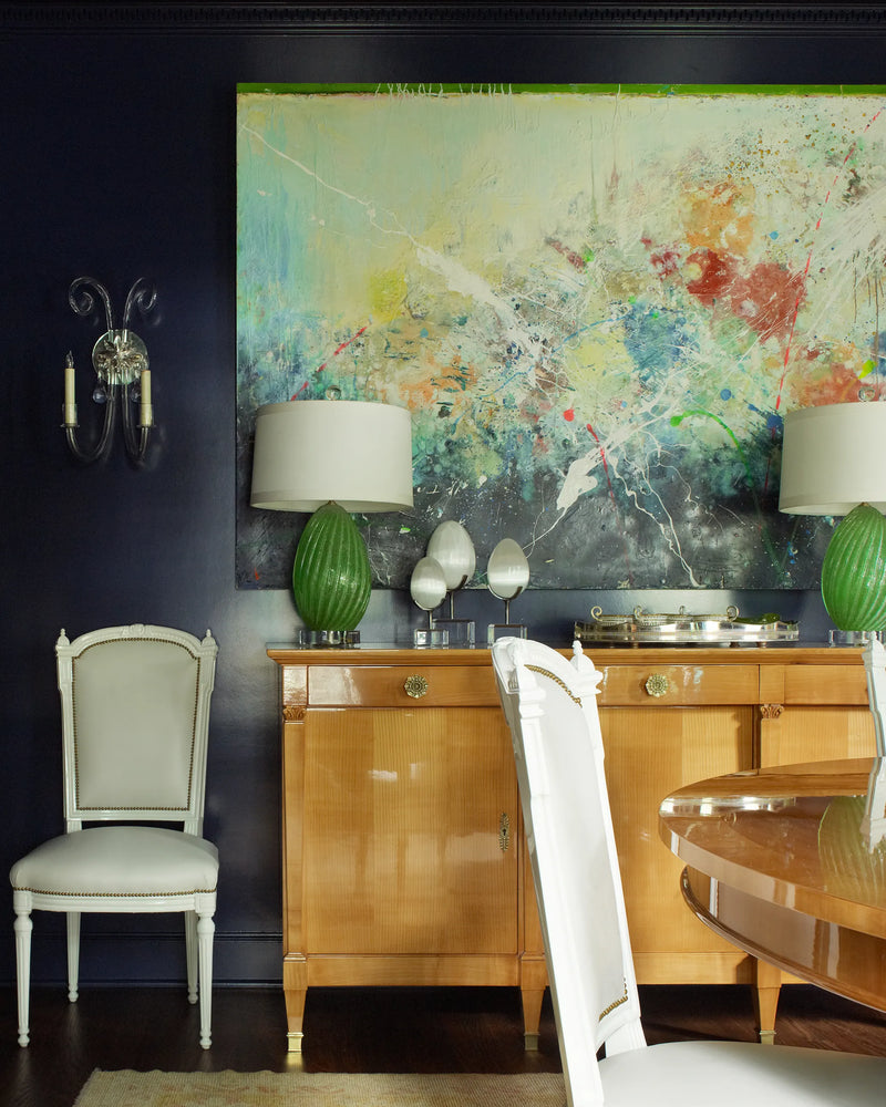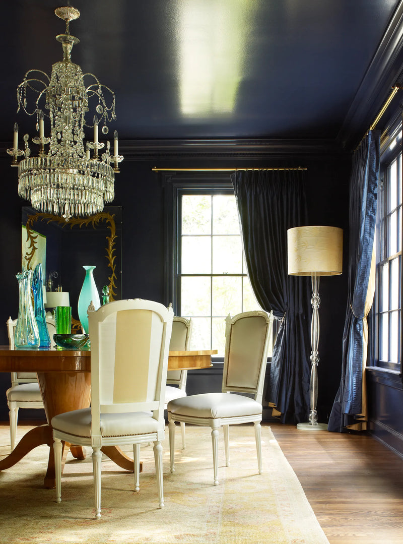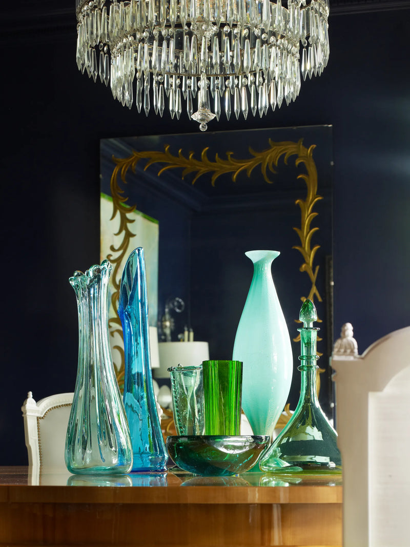 The dining room, with its striking midnight blue Venetian plaster walls and ceiling, became a dramatic cocoon with navy silk draperies trimmed in gold. To further the brightening effect, Showers selected a pale gold and cream Oushak rug and covered the chairs in platinum leather accented with gold and cream sateen. A collection of turquoise Venetian glass reflects light beautifully from atop a gleaming pale wood dining table of Showers’ own design.