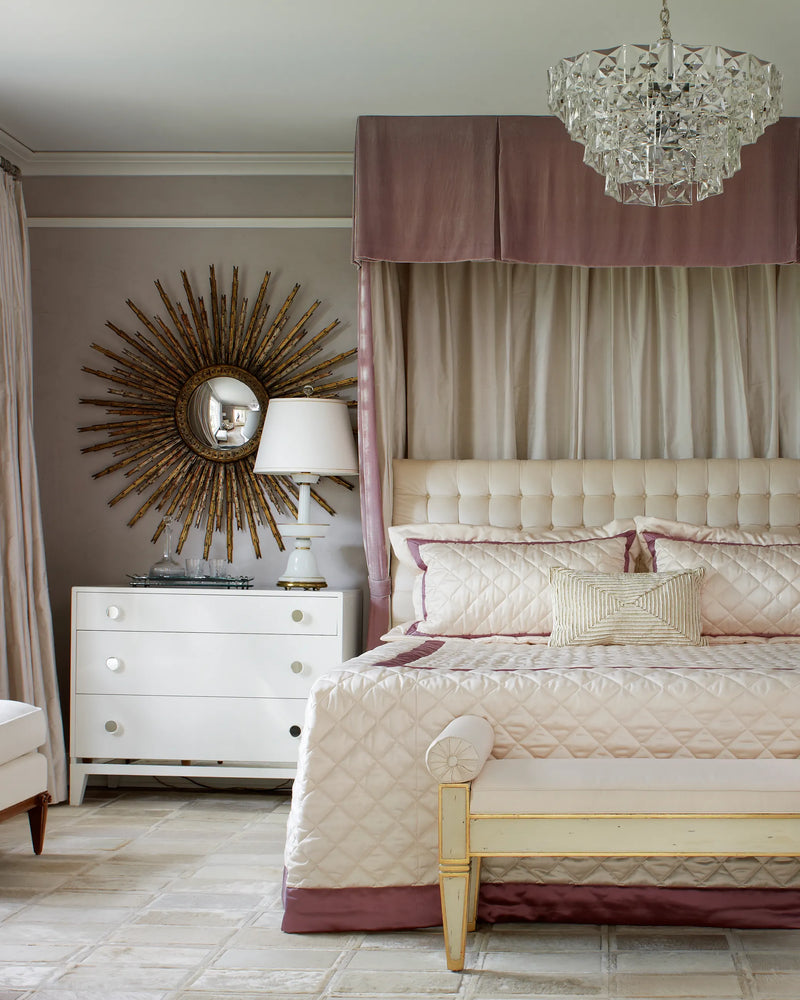 Pale lavender Venetian plaster walls and yards of lavender panne velvet were the muses for the master suite, says Showers, who is known for creating bewitchingly seductive bedrooms for her clients. A custommade, quilted sateen bedspread was inspired by a photograph of Drew Barrymore lounging on a bed covered in a similar quilted spread that Sherri loved. White lacquer nightstands framing the bed are set off by a pair of 19th-century opaline lamps and two large antique soleil mirrors, all from Paris. “I can’t deny I get a big kick out of that bedroom,” says Showers. “I love glamour.”