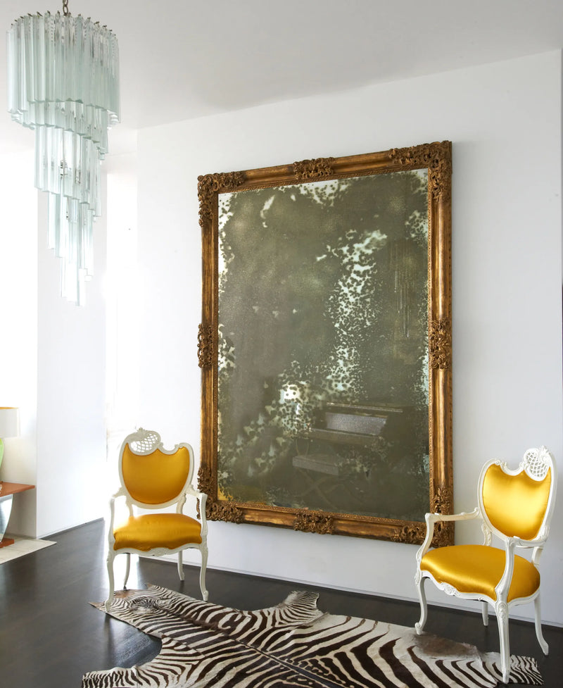 One of my favorite things about working with this client is her complete fearlessness about mixing old and new. She’s never reluctant when it comes to blending styles and periods. In her entry hall, we used an eighteenth-century piano, a nineteenth-century Napoleon III mirror, twentieth-century Louis XV–style chairs from the Eden Roc Hotel, and a 1950s clear Murano chandelier. They work together in such a smart and unexpected way.