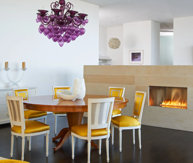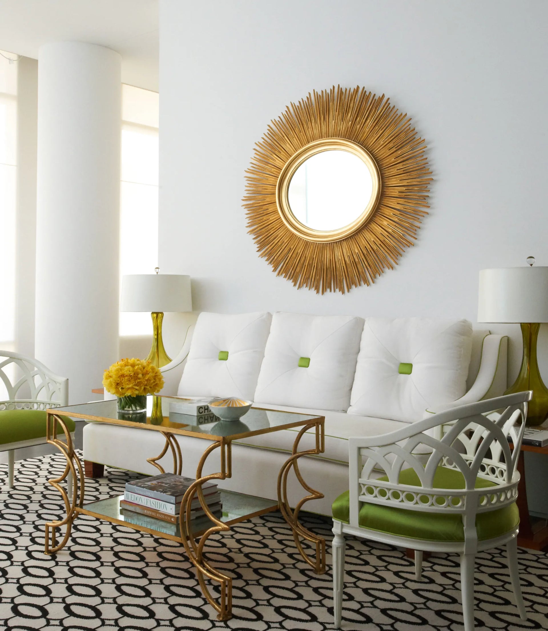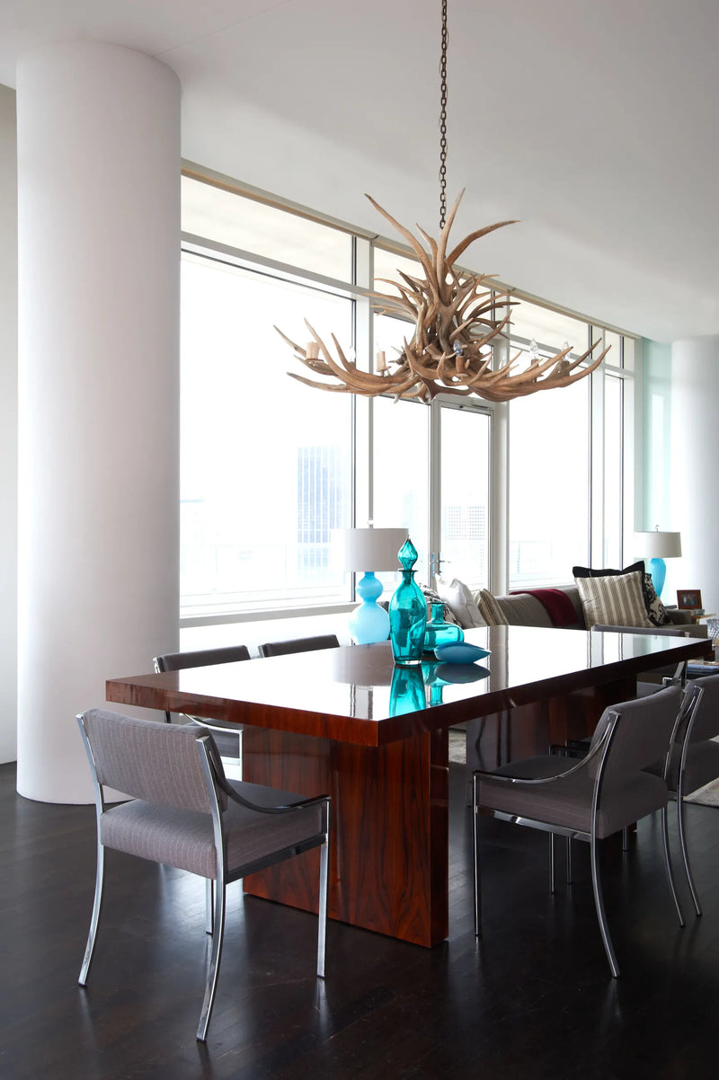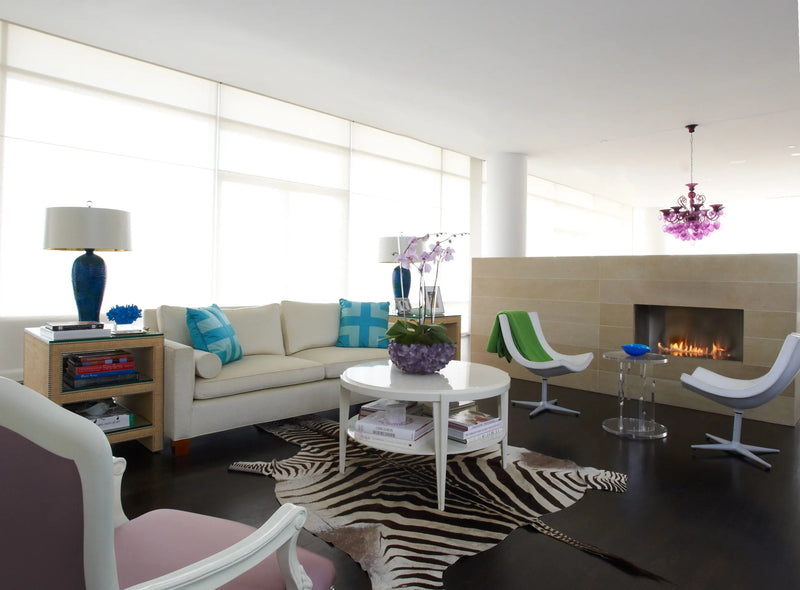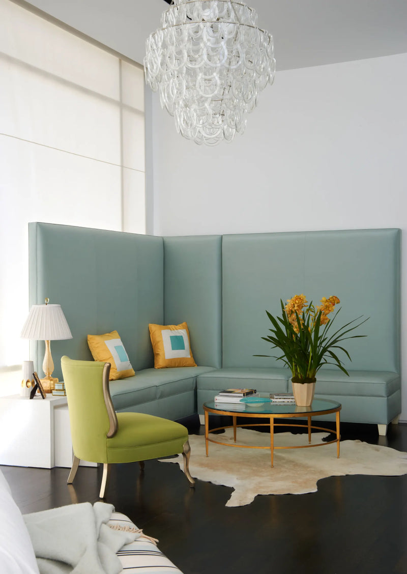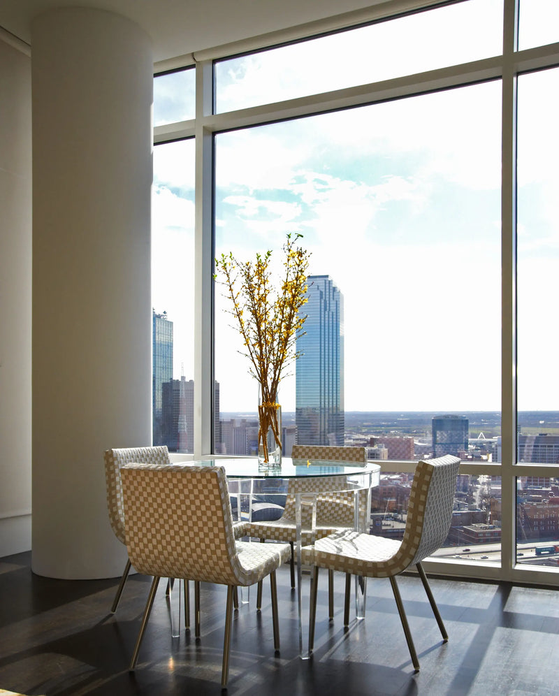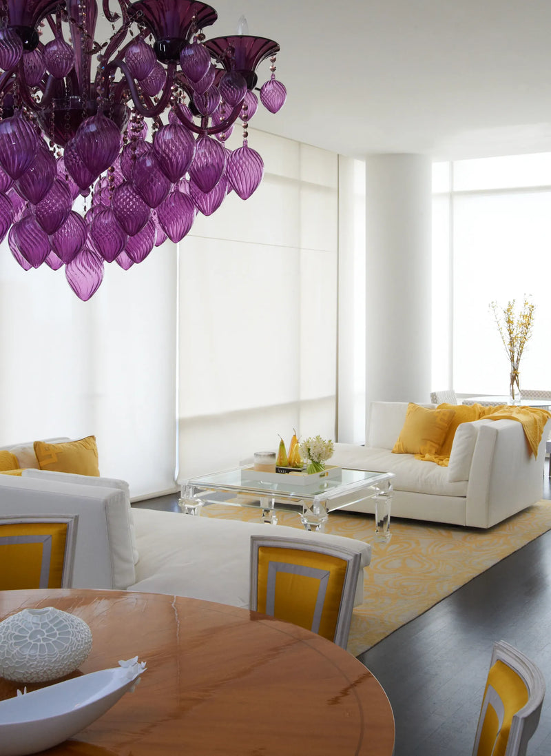 Their daughter had a vision from the start. Because she loves color and combining color with white, that became a common thread throughout her space. She found a lot of interesting pieces on her own, discovering, for example, a vivid amethyst chandelier in Los Angeles to go with the yellow satin Louis XVI–style chairs I’d found in Paris. The architecture revolves around the city views, and so did the design. The loft-like interior has few walls, and windows everywhere, so we focused on using low-profile, light, and—in the case of a Lucite dining table—transparent furniture.