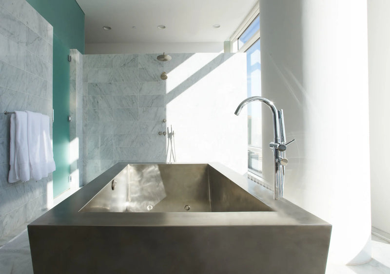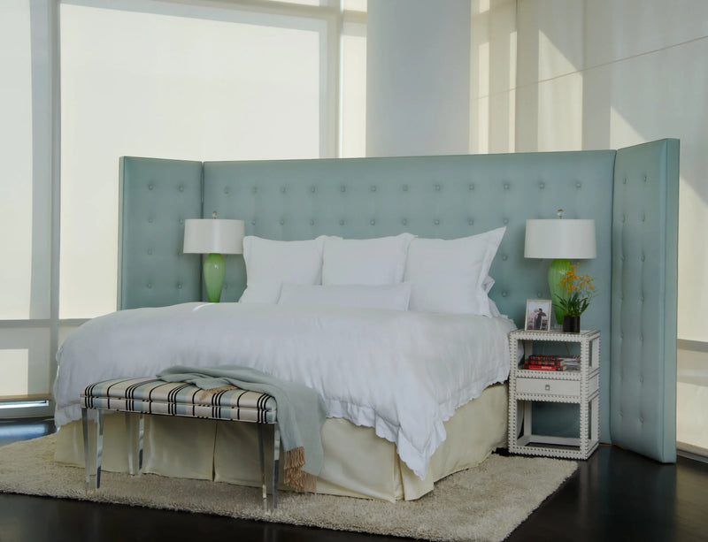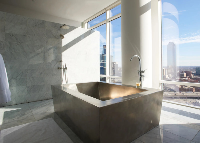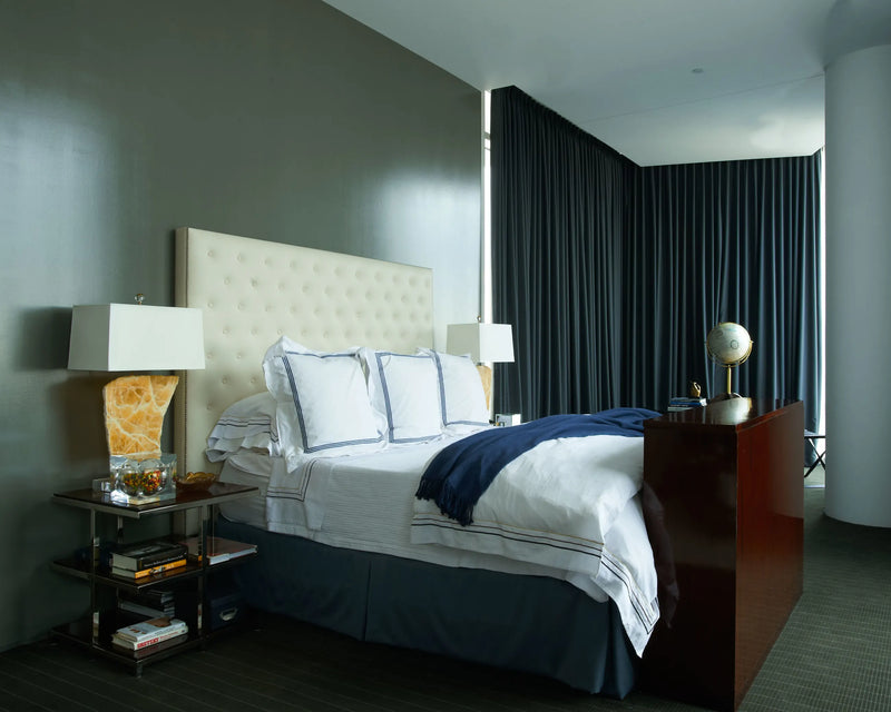 The views made her bedroom one of the biggest challenges of all. There are two walls that are not glass—one of which definitely could not accommodate a bed. The other wall was the obvious choice for the bed, but it didn’t allow for the best view of the city, which she wanted to see upon waking in the morning. That view was nonnegotiable as far as she was concerned, so we fabricated the headboard itself as a wall in the corner. On the opposite side of the room, we created a matching upholstered corner wall, which contains a seating area. One of my favorite color combinations is Benjamin Moore’s Palladian Blue mixed with almost any green. So the headboard and seating walls were made of a silk in that color, accented with green lamps on either side of the bed and a chic green chair in the sitting area. “Spa-like” is a term so ubiquitous that it’s almost meaningless, but in this bath, it couldn’t be more accurate. The room truly is like a spa in the sky.