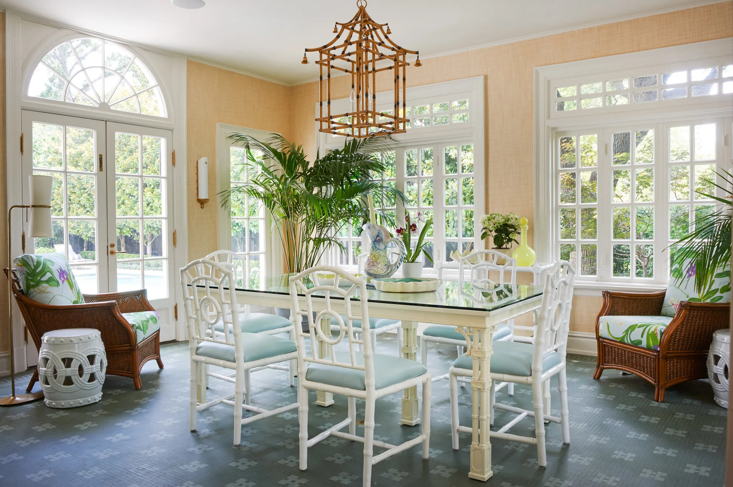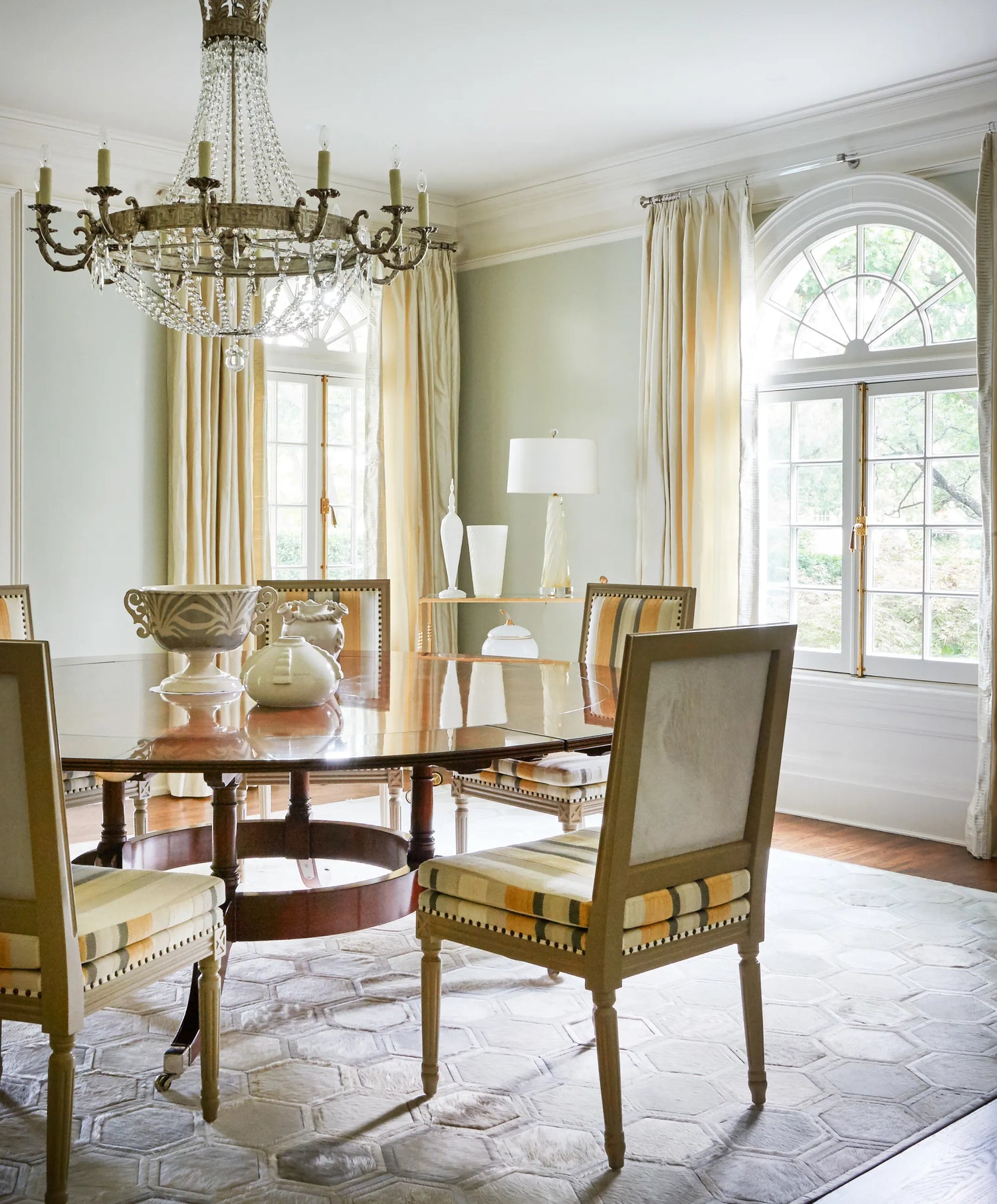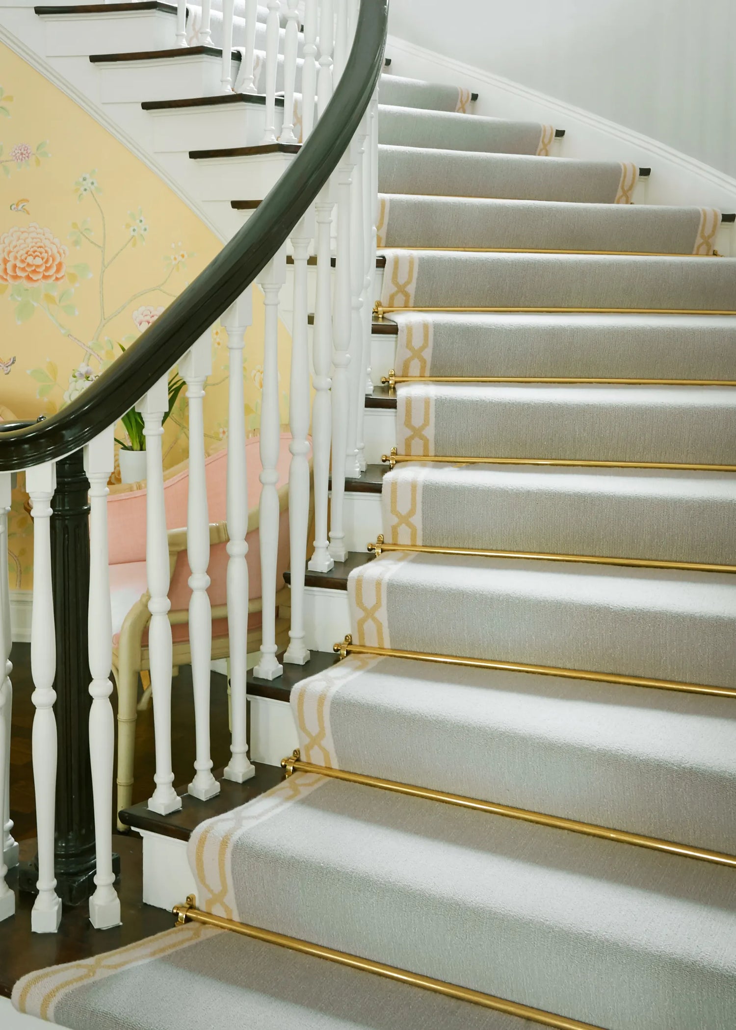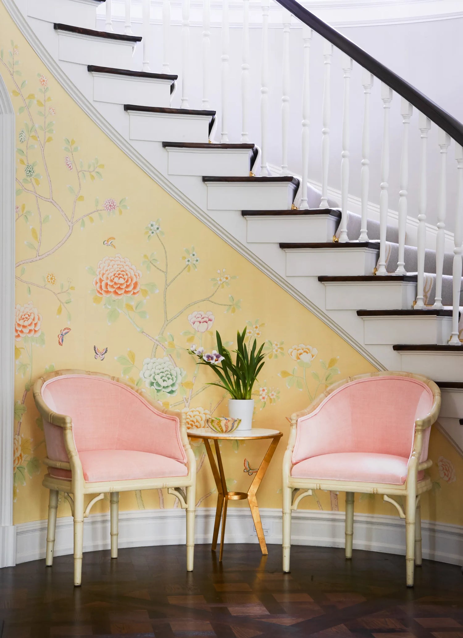 One of the small number of historic homes still in existence in Highland Park, Dallas, by Hal Thomson built in the early twentieth century. This style has been described as American Georgian. A large entry hall with walnut-and-oak parquet custom floors in this 1915 house. Dallas architect Ralph Duesing updated the home. The generous entry hall has custom hand-painted de Gournay wallpaper, vintage Louis XVI-style painted consoles, and a gold Barovier Murano chandelier. A pair of faux-bamboo painted chairs nestle into the curved stairway. A curved stairway carpeted in the Continental style in Martin Patrick Evan custom carpet. Stair retainers by Stark. The living room is large and separated into two seating areas. One side of the large living room has a lovely pair of brass-and-glass Louis XVI-style tables and a coffee table in bronze with an opaline top - all vintage from the 1940s - and the Paris Banquette from the Jan Showers Collection. The floor lamp to the right of the piano is the Capri from the Jan Showers Collection. Art by James Welling. On the opposite side of the living room are a pair of Antique French stools, ceramic lamps by Paul Schneider, a custom Chesterfield Sofa and a custom tea table in gold-leafed steel. Art by Toby Ziegler. One of my favorite rooms in the house is a chocolate-brown bar with a custom banquettes in ivory-tufted leather and is perfect for entertaining. The solarium in this house is now used as the family's casual dining room with chairs for reading and lounging. The wallcovering is by Phillip Jeffries. Outside the lush gardens and statues bring the inside out.