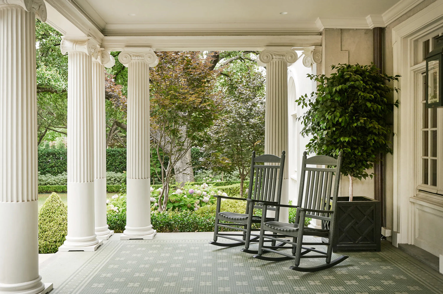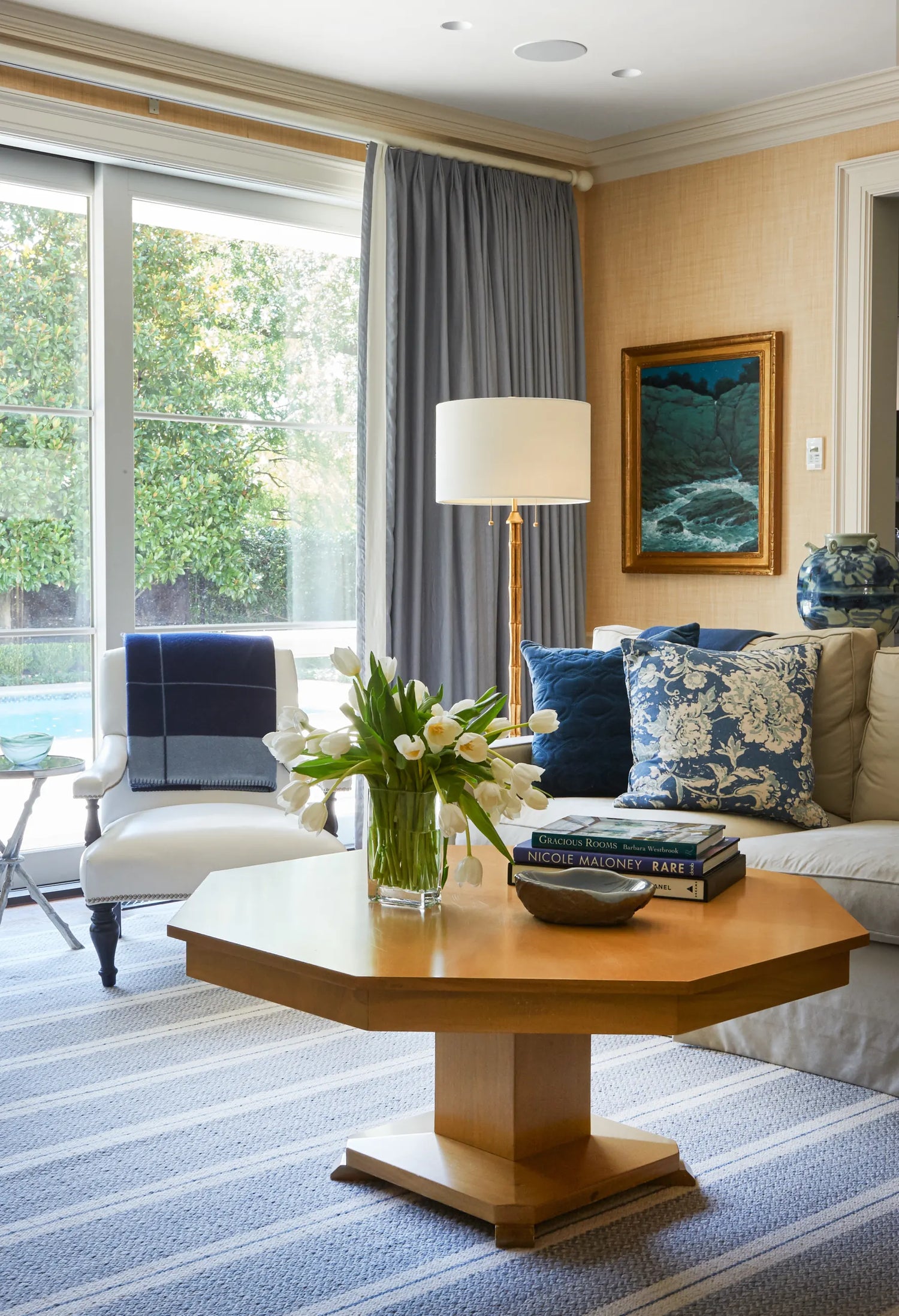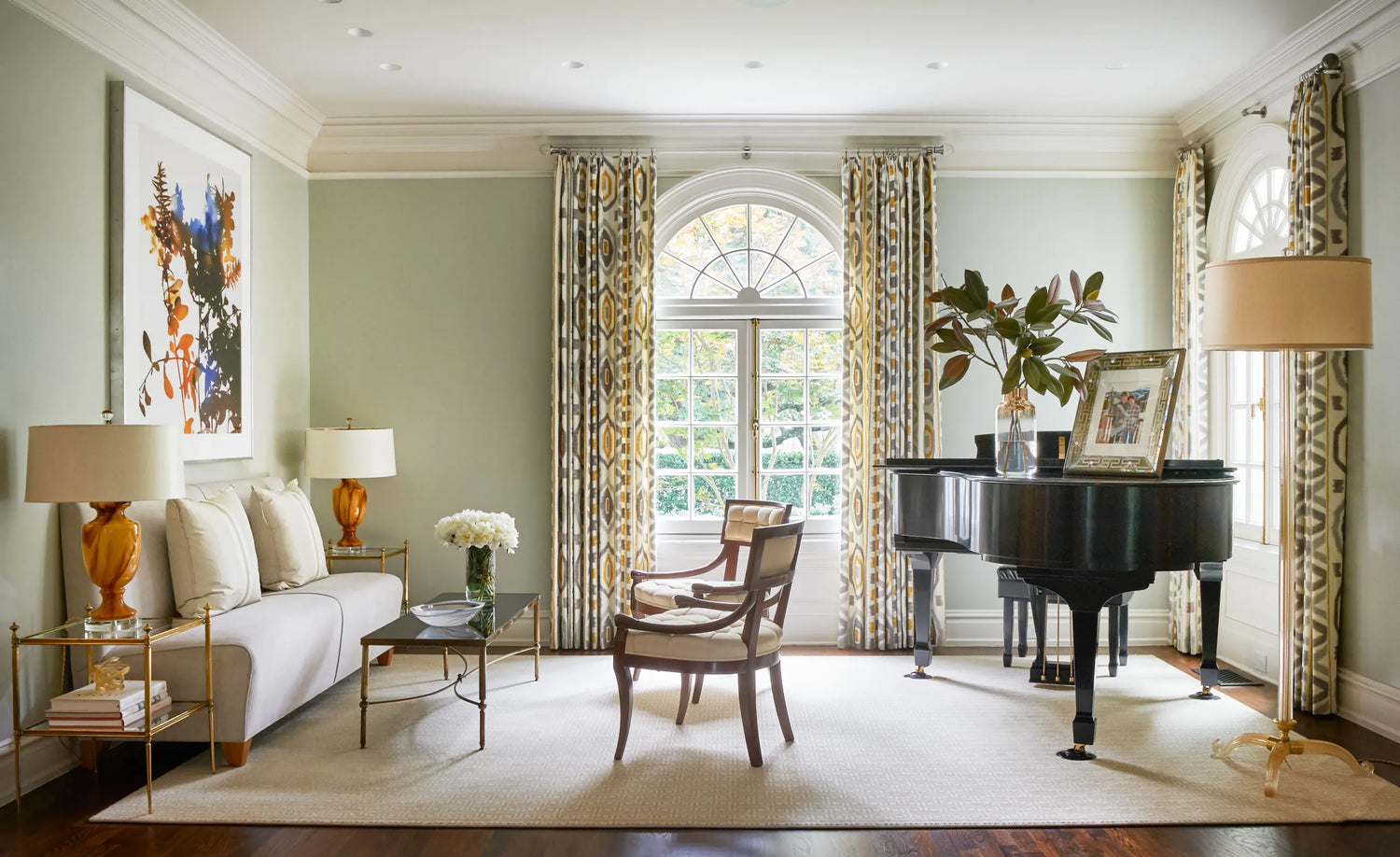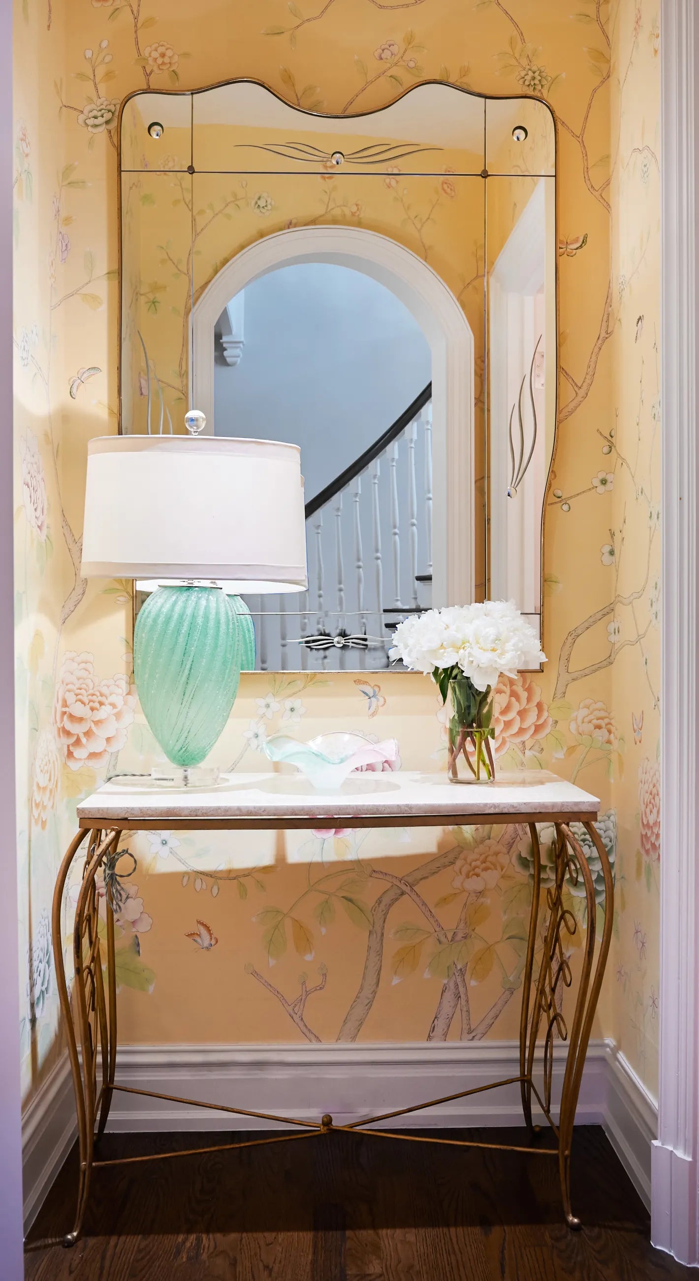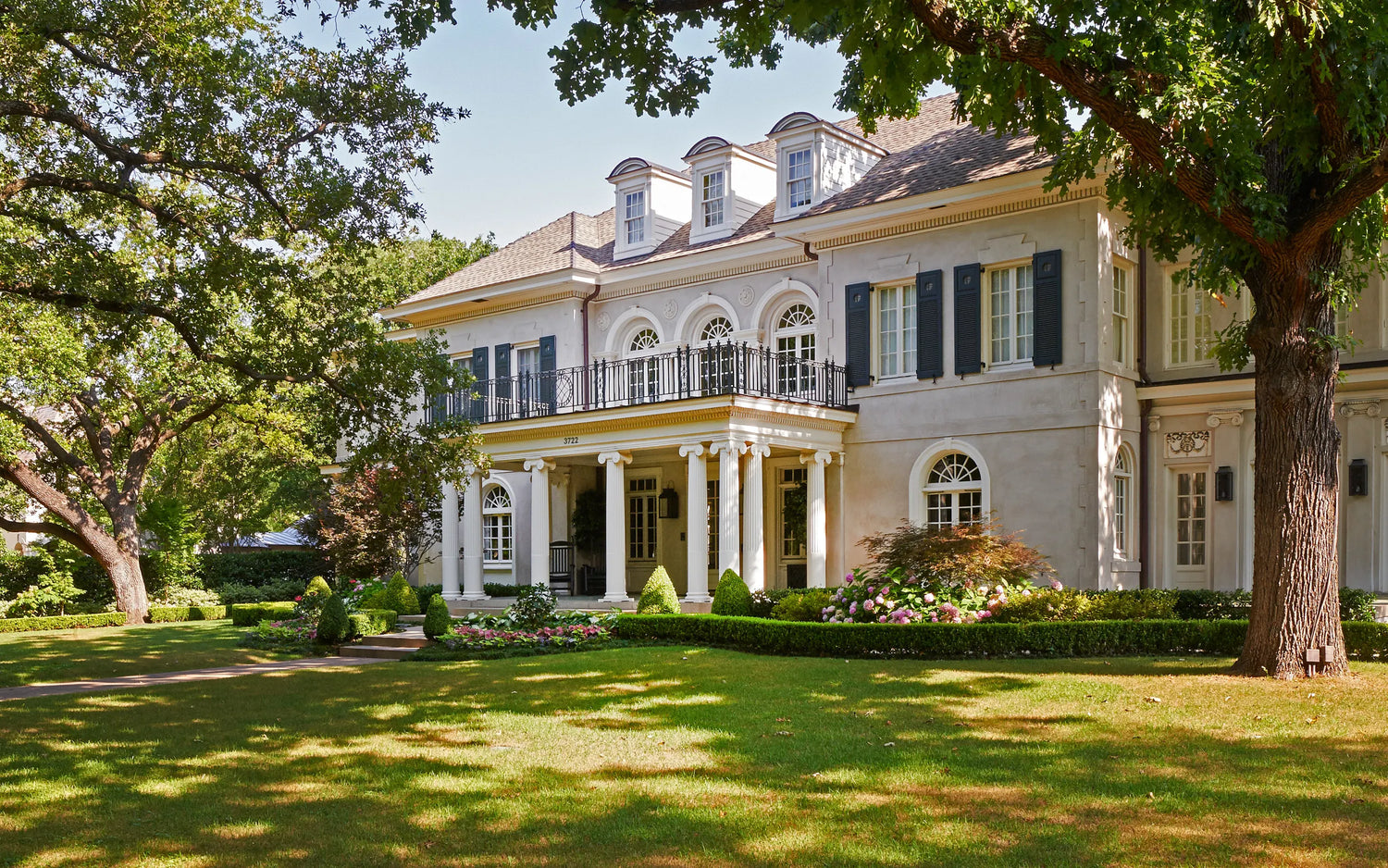 One of the small number of historic homes still in existence in Highland Park, Dallas, by Hal Thomson built in the early twentieth century. This style has been described as American Georgian. A large entry hall with walnut-and-oak parquet custom floors in this 1915 house. Dallas architect Ralph Duesing updated the home. The generous entry hall has custom hand-painted de Gournay wallpaper, vintage Louis XVI-style painted consoles, and a gold Barovier Murano chandelier. A pair of faux-bamboo painted chairs nestle into the curved stairway. A curved stairway carpeted in the Continental style in Martin Patrick Evan custom carpet. Stair retainers by Stark. The living room is large and separated into two seating areas. One side of the large living room has a lovely pair of brass-and-glass Louis XVI-style tables and a coffee table in bronze with an opaline top - all vintage from the 1940s - and the Paris Banquette from the Jan Showers Collection. The floor lamp to the right of the piano is the Capri from the Jan Showers Collection. Art by James Welling. On the opposite side of the living room are a pair of Antique French stools, ceramic lamps by Paul Schneider, a custom Chesterfield Sofa and a custom tea table in gold-leafed steel. Art by Toby Ziegler. One of my favorite rooms in the house is a chocolate-brown bar with a custom banquettes in ivory-tufted leather and is perfect for entertaining. The solarium in this house is now used as the family's casual dining room with chairs for reading and lounging. The wallcovering is by Phillip Jeffries. Outside the lush gardens and statues bring the inside out.