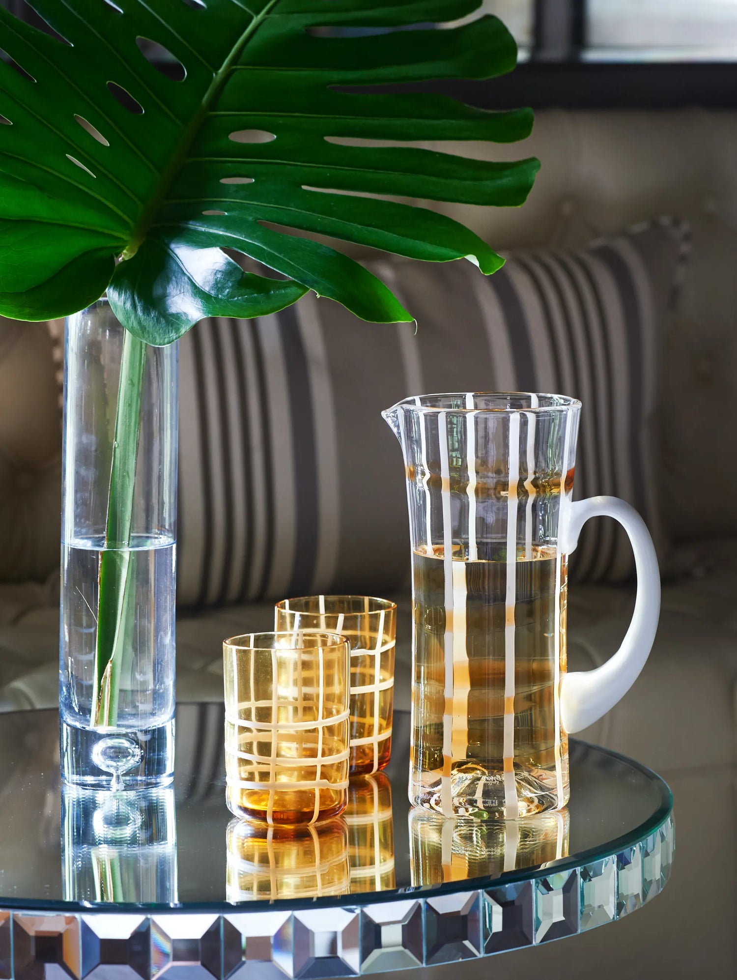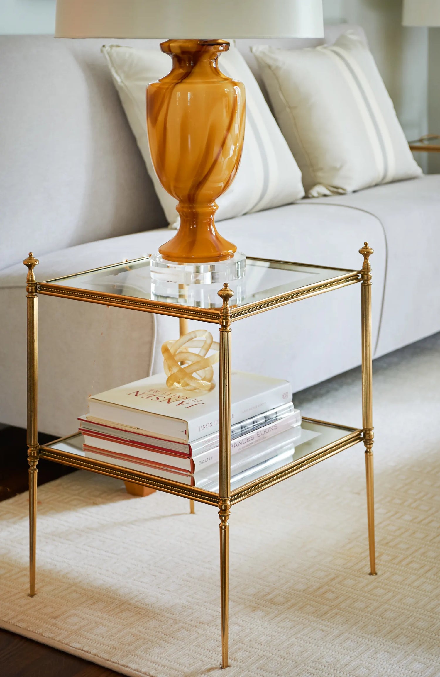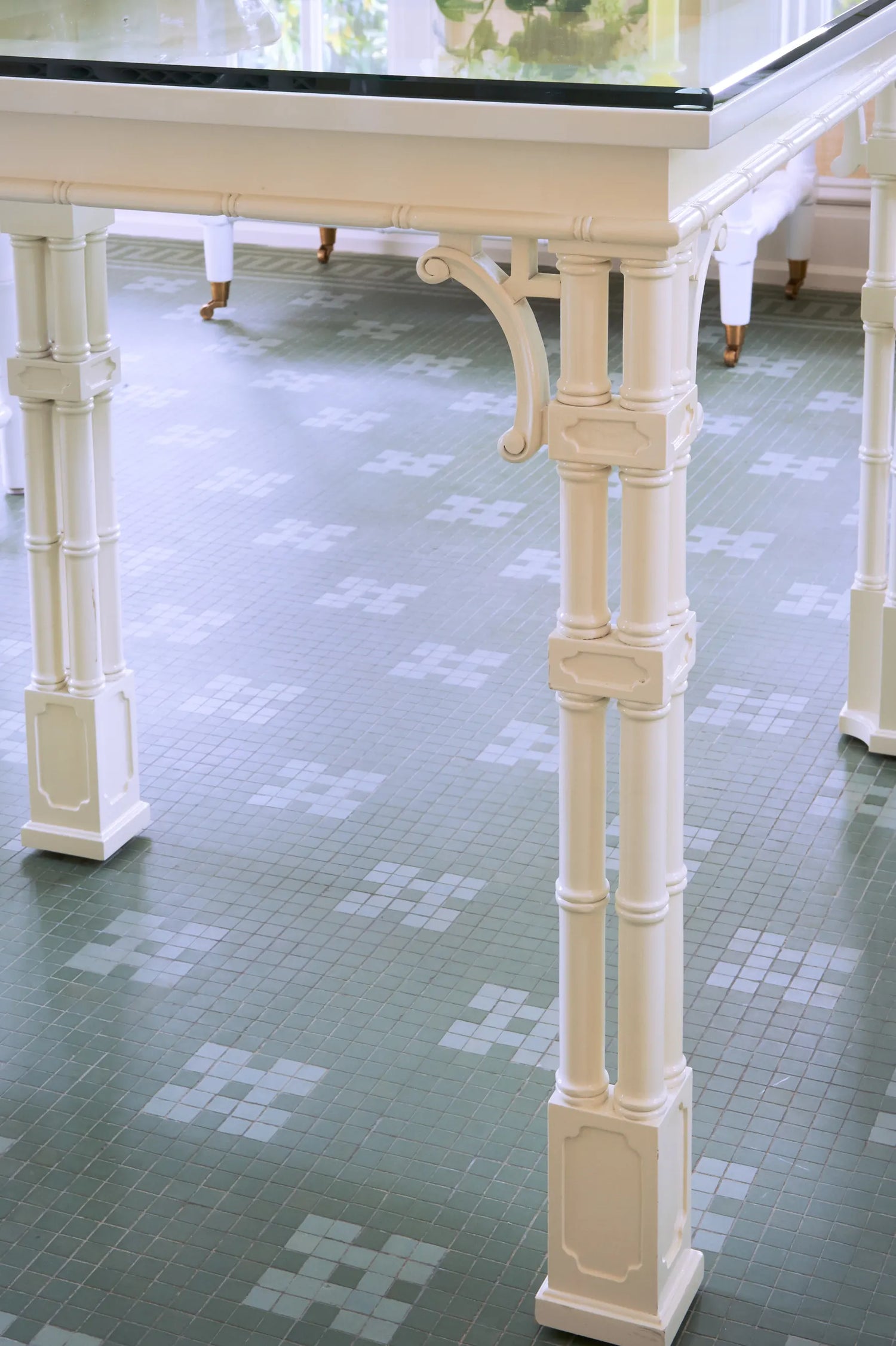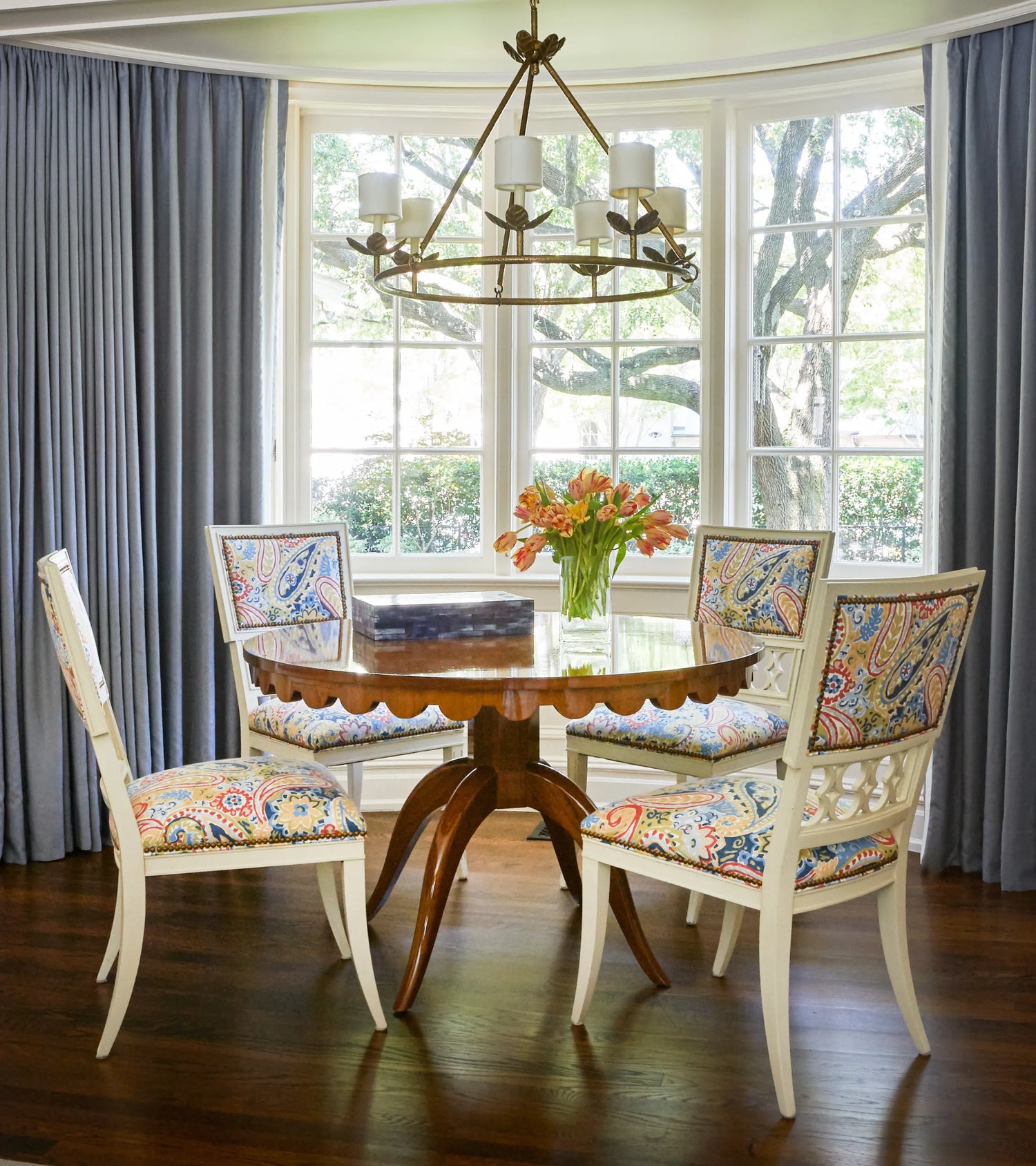 One of the small number of historic homes still in existence in Highland Park, Dallas, by Hal Thomson built in the early twentieth century. This style has been described as American Georgian. A large entry hall with walnut-and-oak parquet custom floors in this 1915 house. Dallas architect Ralph Duesing updated the home. The generous entry hall has custom hand-painted de Gournay wallpaper, vintage Louis XVI-style painted consoles, and a gold Barovier Murano chandelier. A pair of faux-bamboo painted chairs nestle into the curved stairway. A curved stairway carpeted in the Continental style in Martin Patrick Evan custom carpet. Stair retainers by Stark. The living room is large and separated into two seating areas. One side of the large living room has a lovely pair of brass-and-glass Louis XVI-style tables and a coffee table in bronze with an opaline top - all vintage from the 1940s - and the Paris Banquette from the Jan Showers Collection. The floor lamp to the right of the piano is the Capri from the Jan Showers Collection. Art by James Welling. On the opposite side of the living room are a pair of Antique French stools, ceramic lamps by Paul Schneider, a custom Chesterfield Sofa and a custom tea table in gold-leafed steel. Art by Toby Ziegler. One of my favorite rooms in the house is a chocolate-brown bar with a custom banquettes in ivory-tufted leather and is perfect for entertaining. The solarium in this house is now used as the family's casual dining room with chairs for reading and lounging. The wallcovering is by Phillip Jeffries. Outside the lush gardens and statues bring the inside out.